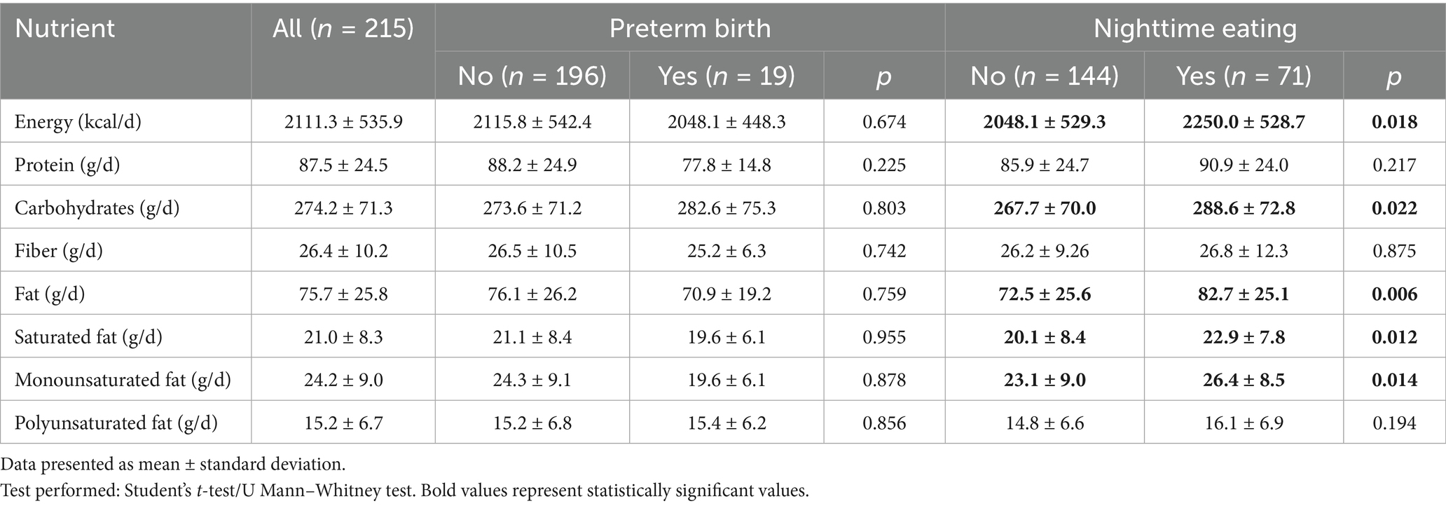 Table 2. Average energy and nutrient consumption during pregnancy according to nighttime eating and preterm birth.