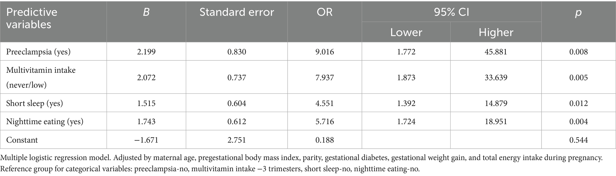 Table 3. Multivariable analysis of nighttime eating and maternal factors in relation to preterm birth risk.