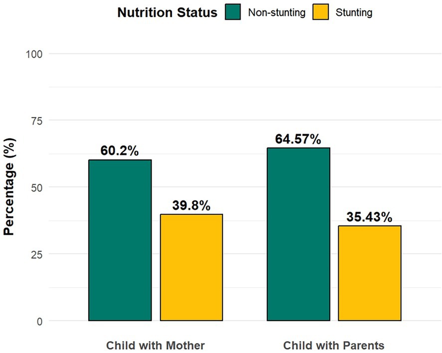 Figure 2. Prevalence of stunting among children living with mother only versus those living with both parents. Comparison of stunting and non-stunting percentages between children living with both parents and those living with mother only. Weighted percentages based on NFHS data.
