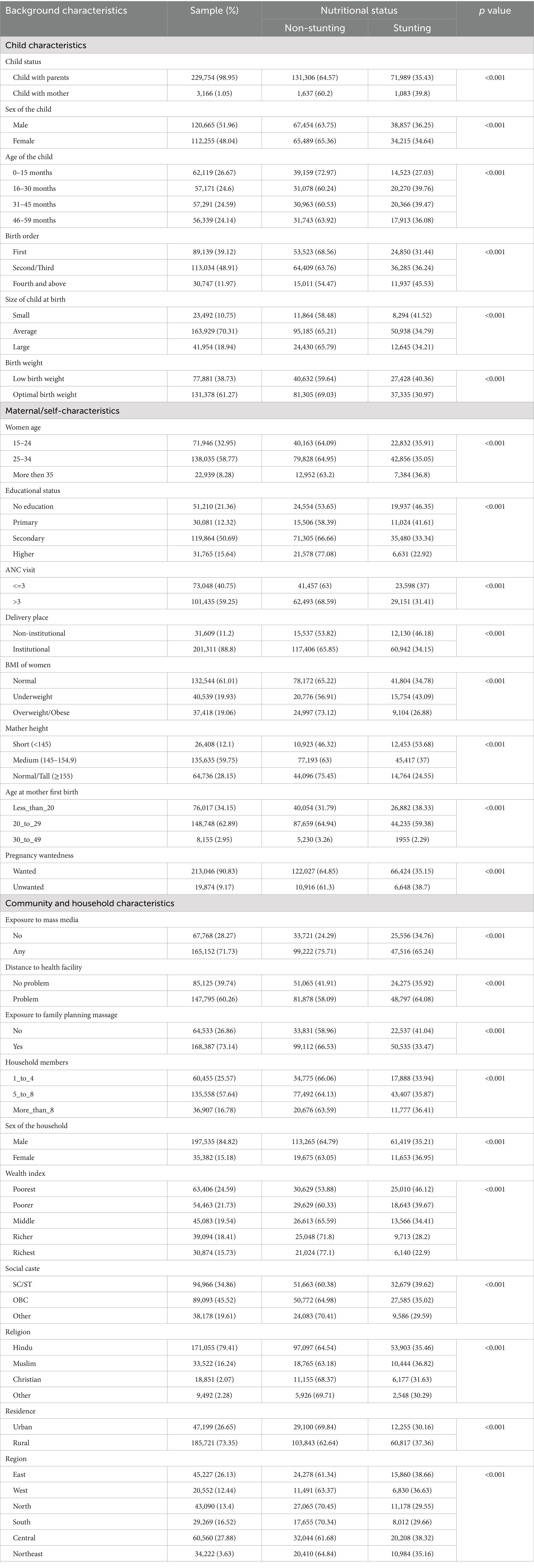 Descriptive statistics were computed to present the background characteristics of the sample by living arrangement and their association with stunting status. Pearson’s chi-square test was used to assess the significance of associations.