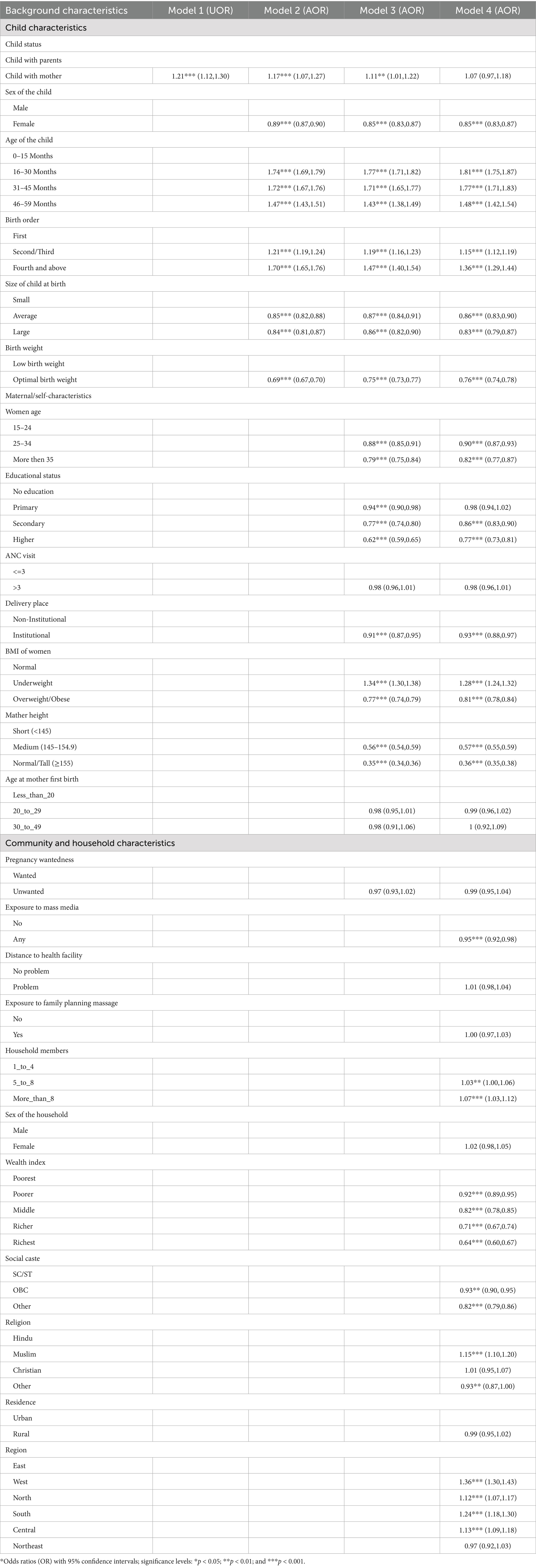 To account for potential confounding factors, a wide range of covariates were included, grouped into child, maternal, household, and community-level characteristics: Child-level variables include sex of the child, age in months (categorized in 15-month intervals), birth order, size at birth (mother’s perception), and birth weight (classified as low or normal). Maternal characteristics consist of age at childbirth, education level, body mass index (BMI), height, age at first birth, number of antenatal care (ANC) visits, place of delivery (institutional or non-institutional), and pregnancy wantedness. Household and community factors encompasses the wealth index (based on household assets), household size, caste group (SC/ST, OBC, others), religion (Hindu, Muslim, Christian, others), place of residence (urban/rural), region (North, South, East, West, Central, Northeast), sex of the household head, distance to healthcare facility, exposure to mass media, and family planning messages.