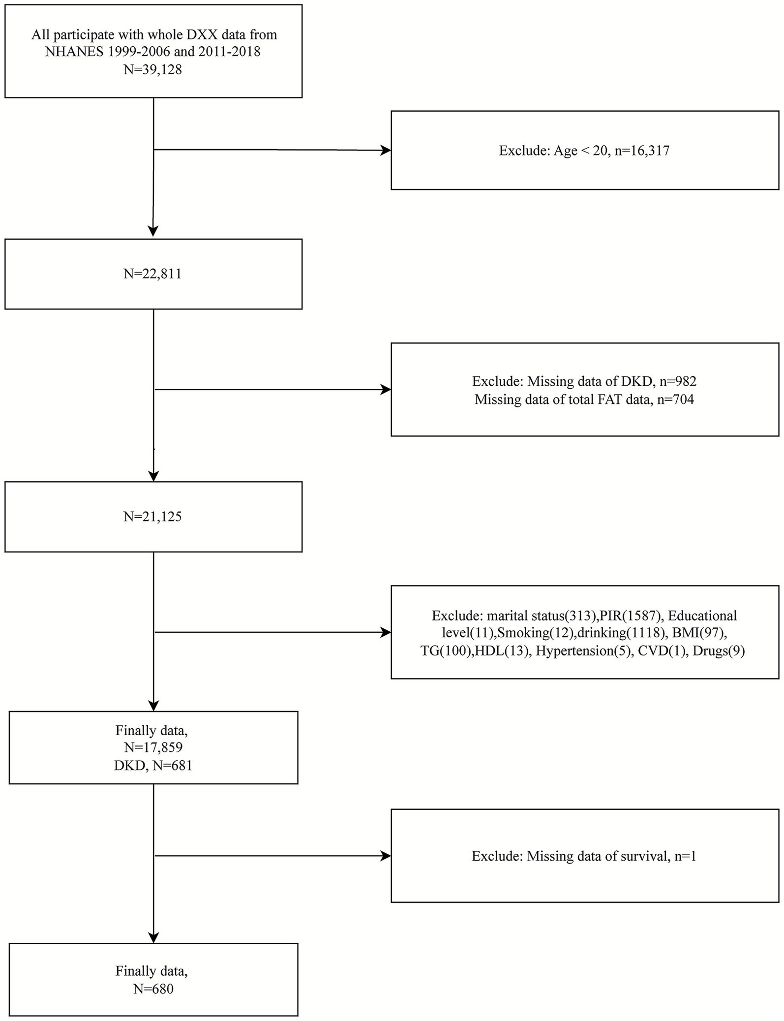 For this study, we selected participants with complete body composition data necessary for calculating the FMR. This included individuals with available measurements obtained via dual-energy X-ray absorptiometry (DXA) from NHANES examination data, including body fat percentage and muscle mass. Data were extracted from the 1999–2006 and 2011–2018 NHANES cycles, which provide extensive information on demographics, health status, and body composition. Initially, a total of 39,128 individuals with complete DXA data were identified. After applying the exclusion criteria, 16,317 individuals under 20 years, 982 participants with missing DKD data, 704 participants lacking relevant FMR data, and 3,267 participants missing other essential data were excluded. As a result, 17,859 adults remained in the initial cohort, and finally, 680 individuals diagnosed with DKD fulfilled the criteria and were ultimately included (Figure 1).