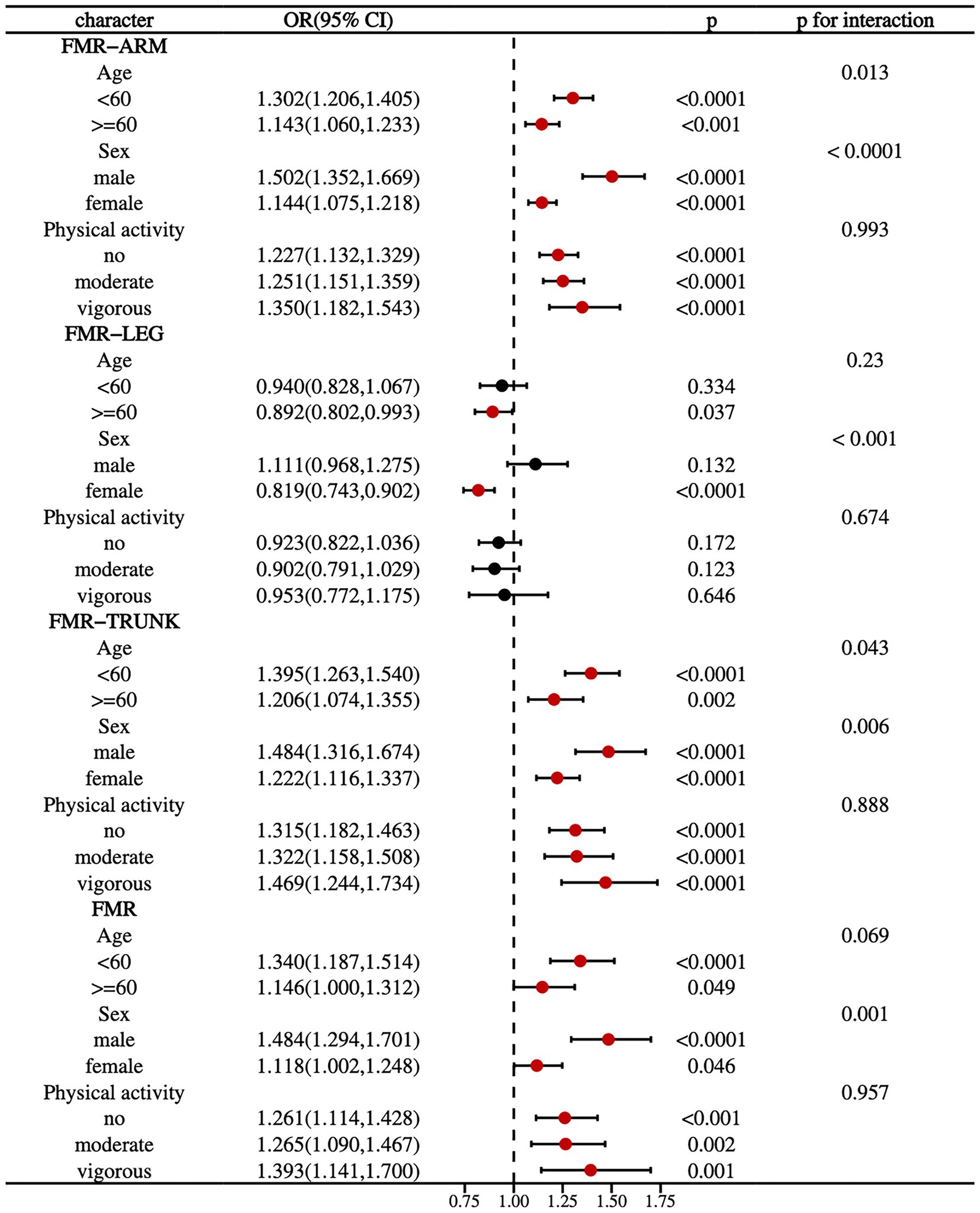 Stratified subgroup analyses by age, sex, and physical activity demonstrated consistent associations between FMR and DKD prevalence across the majority of subgroups (Figure 2). Significant interactions were observed for the prevalence of DKD in arm-FMR and trunk-FMR when stratified by age and sex. Specifically, younger participants (<60 years) and male individuals with higher FMR exhibited an increased risk of developing DKD (P for interaction < 0.05).