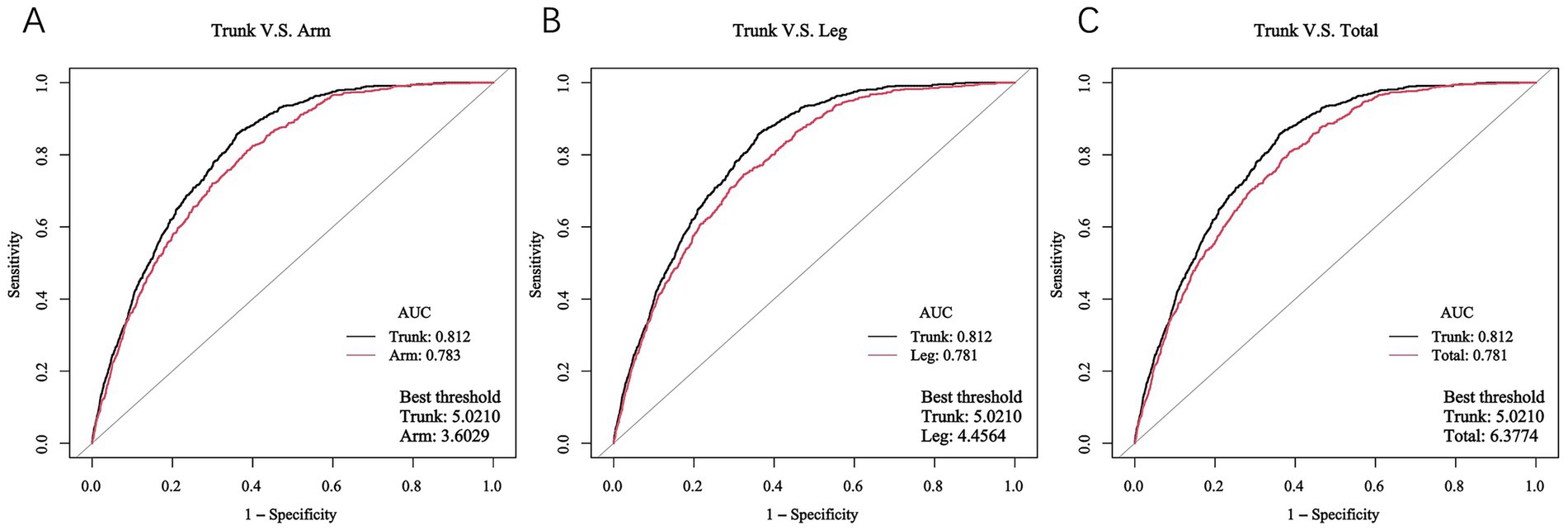 Figure 3. ROC curves of different FMRs in identifying DKD. (A) Trunk-FMR: Sensitivity = 85.9%, Specificity = 63.8%, Positive LR = 2.37, Negative LR = 0.22; (B) Arm-FMR: Sensitivity = 81.1%, Specificity = 61.5%, Positive LR = 2.11, Negative LR = 0.31; (C) Leg-FMR: Sensitivity = 74.6%, Specificity = 67.6%, Positive LR = 2.30, Negative LR = 0.38.
