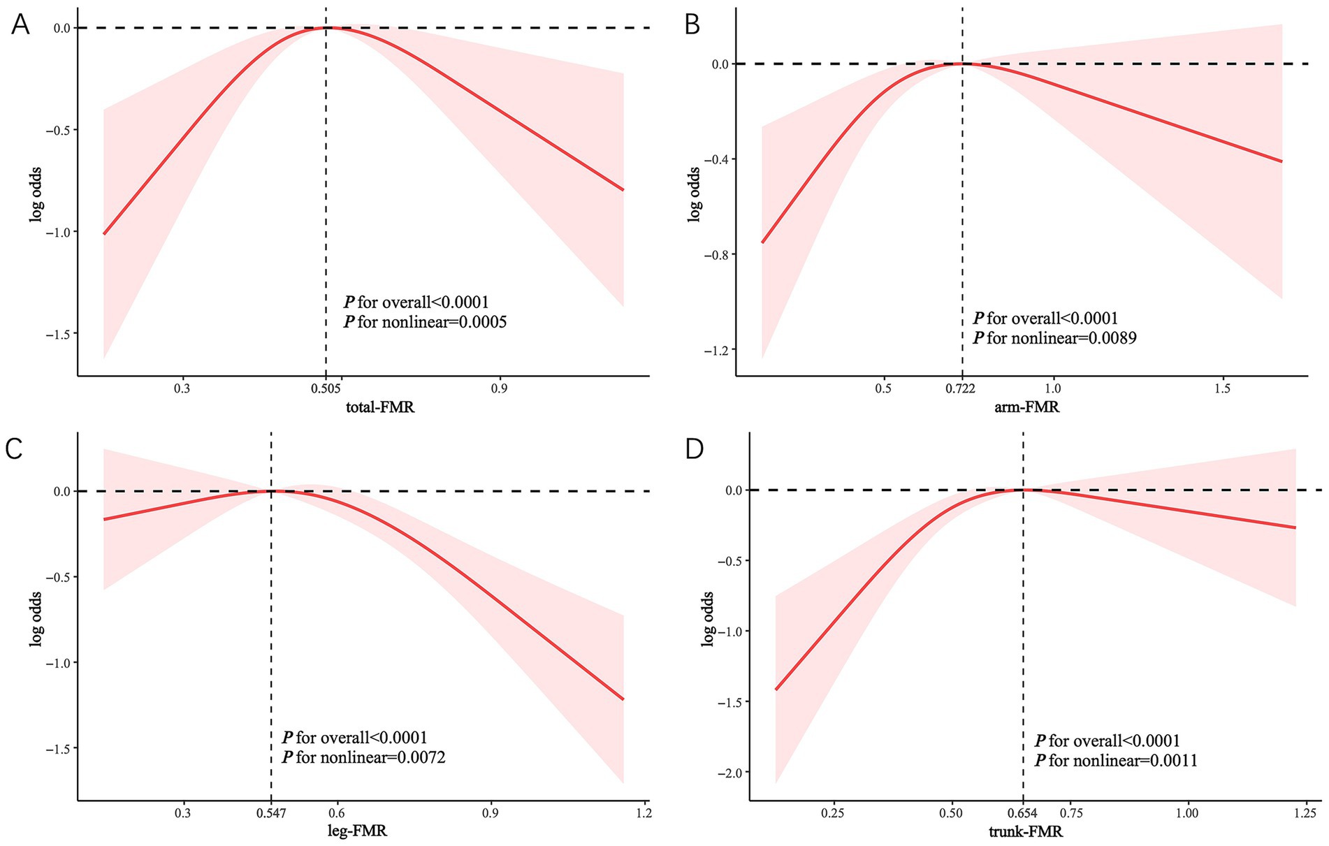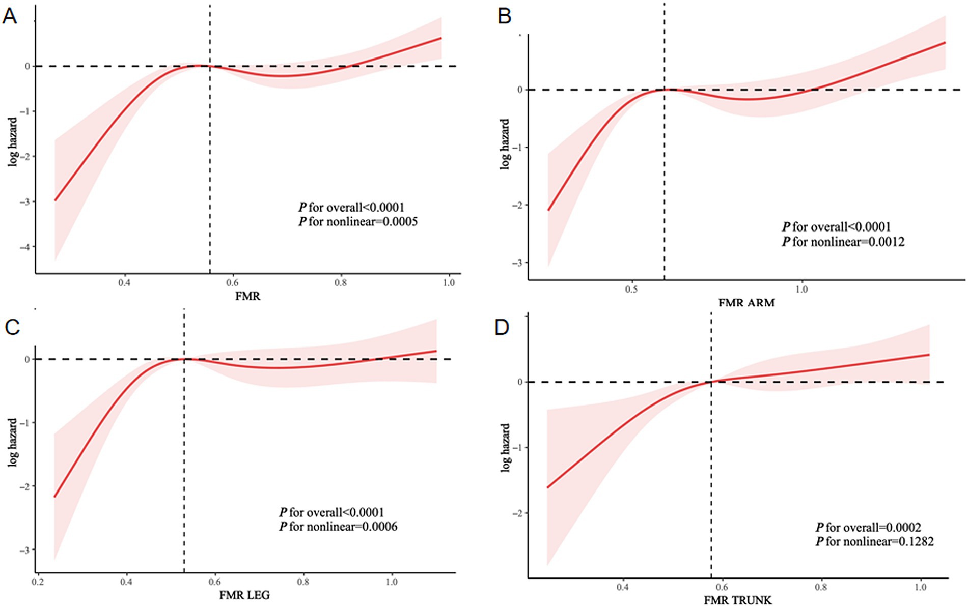 Figure 6. Non-linear associations between different FMRs and all-cause mortality. (A) Total-FMR, (B) Arm-FMR, (C) Leg-FMR, (D) Trunk-FMR.