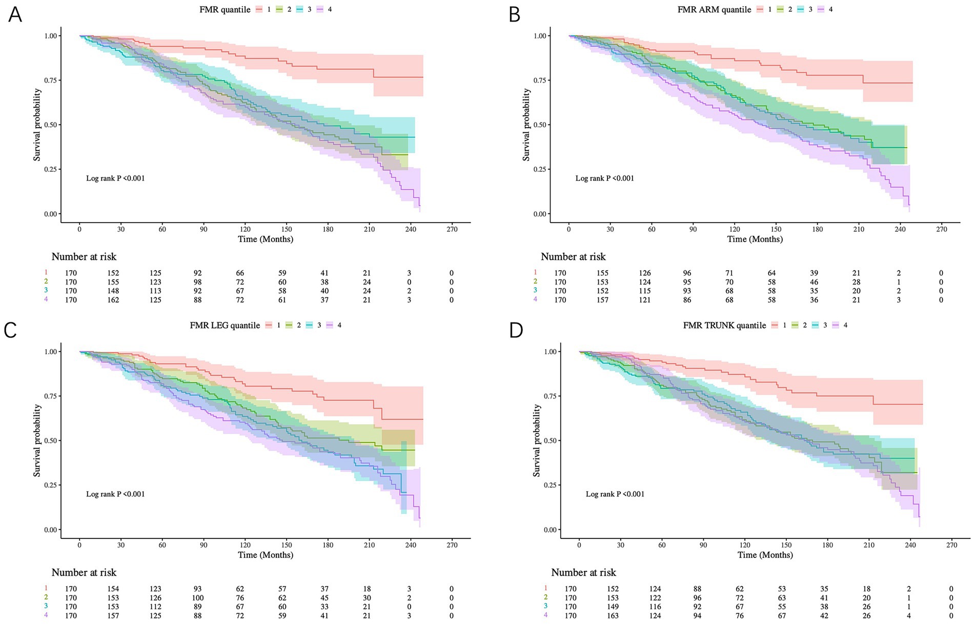 Figure 5. Kaplan–Meier curves displayed for all-cause mortality according to the quartiles of FMR. (A) Total-FMR, (B) Trunk-FMR, (C) Leg-FMR, (D) Arm-FMR. The shaded bands around the survival curves represent the 95% confidence intervals. Patient stratification into quartiles was based on the following cut-points derived from the study population: Total-FMR: Q1 (lowest 25%): < 0.42; Q2: 0.42–0.56; Q3: 0.56–0.72; Q4 (highest 25%): ≥ 0.72. Trunk-FMR: Q1: < 0.46; Q2: 0.46–0.58; Q3: 0.58–0.72; Q4: ≥ 0.72. Leg-FMR: Q1: < 0.39; Q2: 0.39–0.53; Q3: 0.53–0.74; Q4: ≥ 0.74. Arm-FMR: Q1: < 0.41; Q2: 0.41–0.59; Q3: 0.59–0.89; Q4: ≥ 0.89.