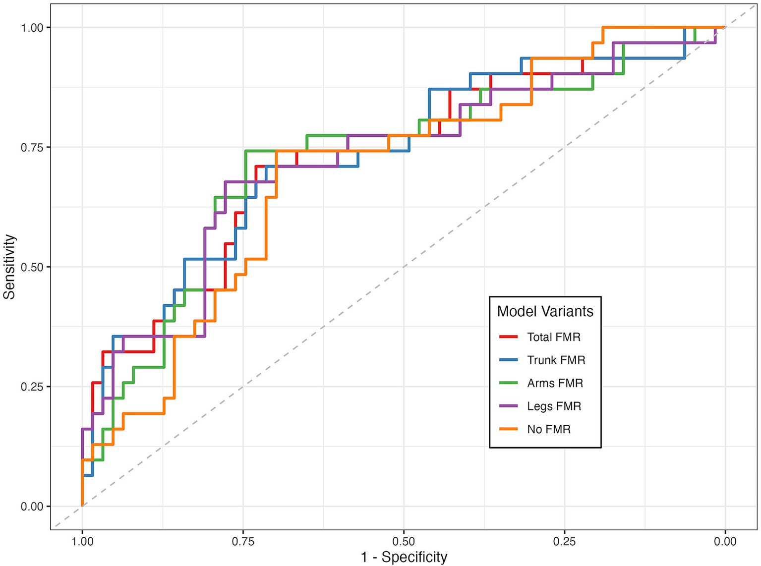 Based on our previous NHANES study findings, we conducted validation in an independent, real-world, hospital-based cohort, which included 94 patients (Supplementary Table S8). A univariate analysis identified several significant predictive factors for DKD risk: HbA1c (OR = 1.298, 95% CI: 1.053–1.623, p = 0.017), total-FMR (OR = 23.132, 95% CI: 1.771–406.856, p = 0.022), trunk-FMR (OR = 10.113, 95% CI: 1.404–90.209, p = 0.027), and arms-FMR (OR = 7.701, 95% CI: 1.045–63.416, p = 0.049 (Supplementary Table S9). Subsequently, we performed a multivariate analysis, incorporating different FMR measurements, HbA1c, and triglycerides (TG) based on the results of the univariate analysis. In the multivariate analysis, trunk-FMR demonstrated the highest discriminatory performance among the site-specific FMR indices (AUC = 0.735, 95% CI: 0.623–0.846), while total-FMR showed the best model fit (AIC = 111.53; Supplementary Table S10; Figure 7). It should be noted that the wide CIs likely reflect the limited sample size and potential variability in clinical measurements. Nevertheless, the direction of the association was consistent with the NHANES analysis, supporting the robustness of trunk-FMR as a correlate of DKD.