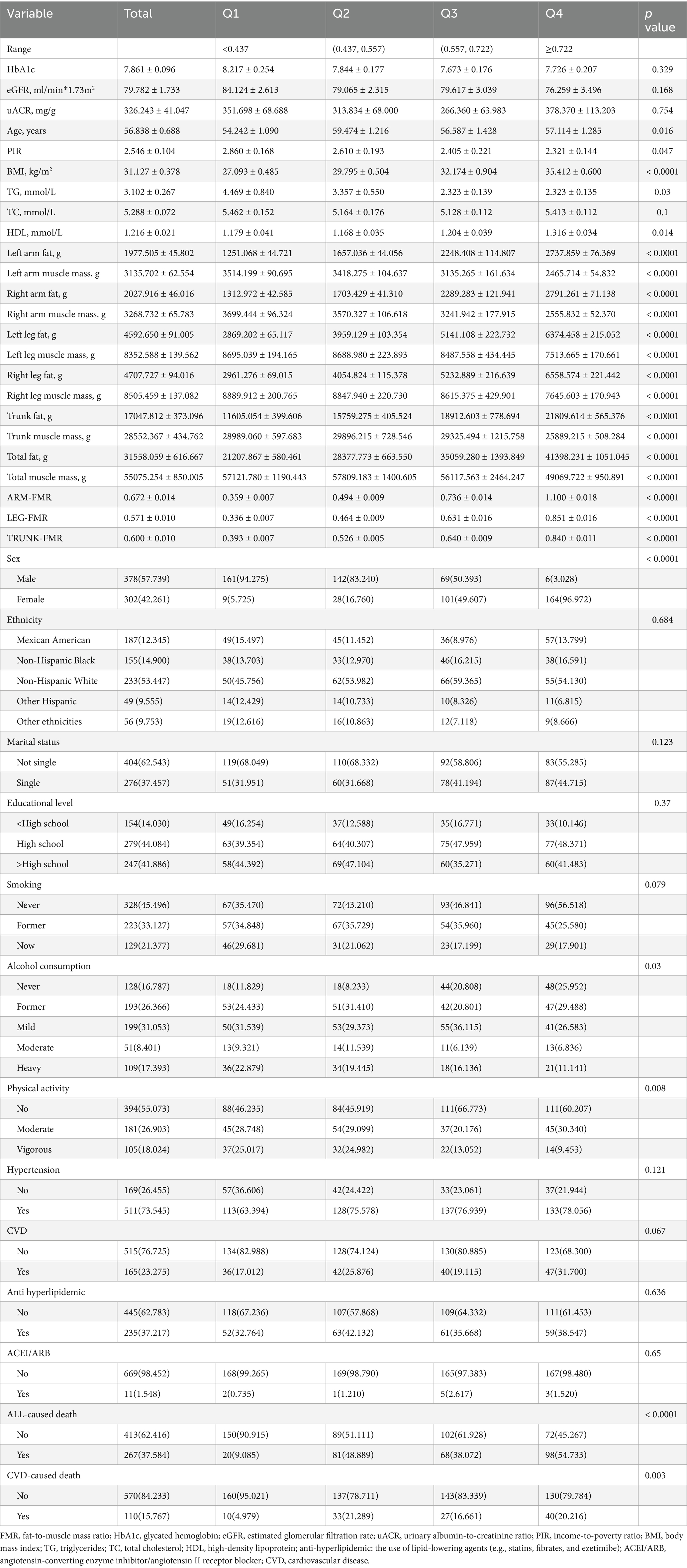 This study utilized NHANES data with a cross-sectional design for baseline assessments. DKD status was determined cross-sectionally at the time of NHANES survey participation according to the KDIGO 2021 Guidelines, which are based on clinical diagnostic criteria, including the presence of albuminuria or a decrease in eGFR (less than 60 mL/min/1.73 m) in patients with diabetes (15). Albuminuria was identified by a urinary albumin-to-creatinine ratio (UACR) of ≥30 mg/g in individuals with diabetes. The CKD-EPI formula was used to derive eGFR values (16). The FMR was assessed as the ratio of fat mass to muscle mass, with both components assessed using DXA from NHANES physical examination data. Given the clinical significance of regional body composition, FMR was assessed for the total body, trunk, legs, and arms. Participants were categorized into quartiles (Q1–Q4) of FMR, with Q1 (lowest FMR) designated as the reference category. Mortality outcomes were prospectively tracked via linkage to the National Death Index through 31 December 2019, with a median follow-up of 97 months. It is important to note that, while mortality was tracked prospectively, DKD status was assessed cross-sectionally. Therefore, this study design does not constitute an incidence cohort for DKD, and no causal inferences can be drawn between FMR and DKD development. Further definitions and classifications of key variables, including diabetes diagnosis, income-to-poverty ratio (PIR), and causes of death, are provided in Supplementary Table S1. These definitions follow the established NHANES and CDC criteria to ensure consistency across analyses.