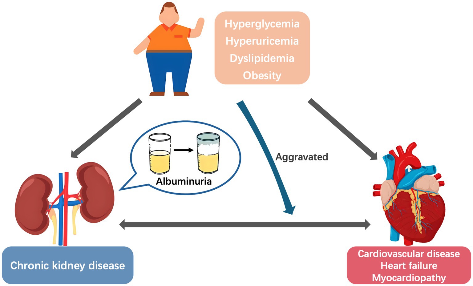 Albuminuria is a core indicator of kidney disease progression and an independent risk factor for cardiovascular disease (CVD) and heart failure (HF) (1–3). With the rising incidence of metabolic diseases, the role of metabolic conditions in the relationship between albuminuria and adverse cardiovascular outcomes has gained increasing attention. Metabolic disorder, renal disease, and CVD often overlap and coexist in affected individuals. In a study involving 11,607 American adults, approximately 26.3% had at least one cardiac, renal, or metabolic disease, 8.0% had two of these conditions, and 1.5% had all three diseases simultaneously (4). Moreover, metabolic risk factors were the main CVD-attributable burdens in China, increasing from 62.80% in 1990 to 70.45% in 2019 (5). Common metabolic abnormalities, including hyperglycemia, hyperuricemia, dyslipidemia, and obesity, not only share common pathophysiological mechanisms with cardiorenal diseases but also exacerbate disease progression when coexisting (6, 7). This interrelationship has led to the concept of Cardiovascular–Kidney–Metabolic syndrome (8, 9). However, metabolic abnormalities appear to be the primary driver, rather than mere contributors, of the “metabolic abnormalities–albuminuria–CVD” cycle. Metabolic abnormalities trigger albuminuria through kidney injury (10) while directly promoting vascular damage (11, 12), thereby initiating the progression of cardiorenal disease (Figure 1). Based on recent clinical research and basic experimental evidence, this research aimed to systematically elucidate the role of metabolic conditions as a driving factor in the relationship between albuminuria and cardiovascular prognosis, and explores the clinical intervention strategies.