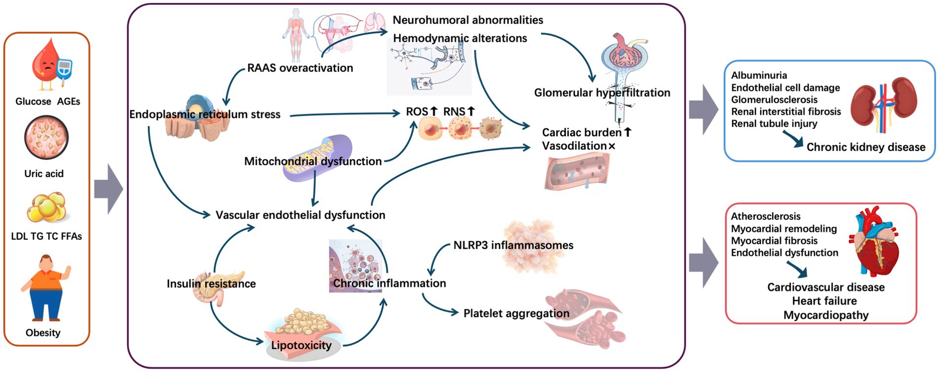 During obesity, adipose tissue secretes various adipokines (e.g., leptin and adiponectin), which can directly or indirectly activate the renin–angiotensin–aldosterone system (RAAS) (66, 67). RAAS can also be activated by chronic hyperglycemia and hyperuricemia through the direct stimulation of renal renin secretion (68–71). This system is involved in blood pressure regulation, fluid homeostasis, and electrolyte balance. When it is overactivated, aldosterone secretion increases, promoting the renal tubular reabsorption of sodium and water, increasing volume load, and exacerbating cardiac burden (72). Angiotensin II induces plaque formation during the early stages, representing one of the most crucial impacts on atherogenesis from the RAAS (73). Additionally, the increased production of angiotensin II induces endothelin expression, which causes systemic vasoconstriction, blood pressure elevation, and cardiac and renal injury worsening (74, 75). Meanwhile, angiotensin II overexpression can induce oxidative stress, ER damage, and apoptosis by activating signaling pathways such as the mTOR/ERK pathway, leading to cardiorenal organ remodeling and dysfunction (76–78). Moreover, UA and angiotensin II synergistically increased inflammation and oxidative stress in human proximal tubular cells through the activation of toll-like receptor 4 (TLR4), in an additive manner (79). In summary, RAAS overactivation associated with metabolic abnormalities induces a vicious cycle of neurohumoral abnormalities, internal environment disturbances, and oxidative stress, further contributing in the development of cardiorenal disease.