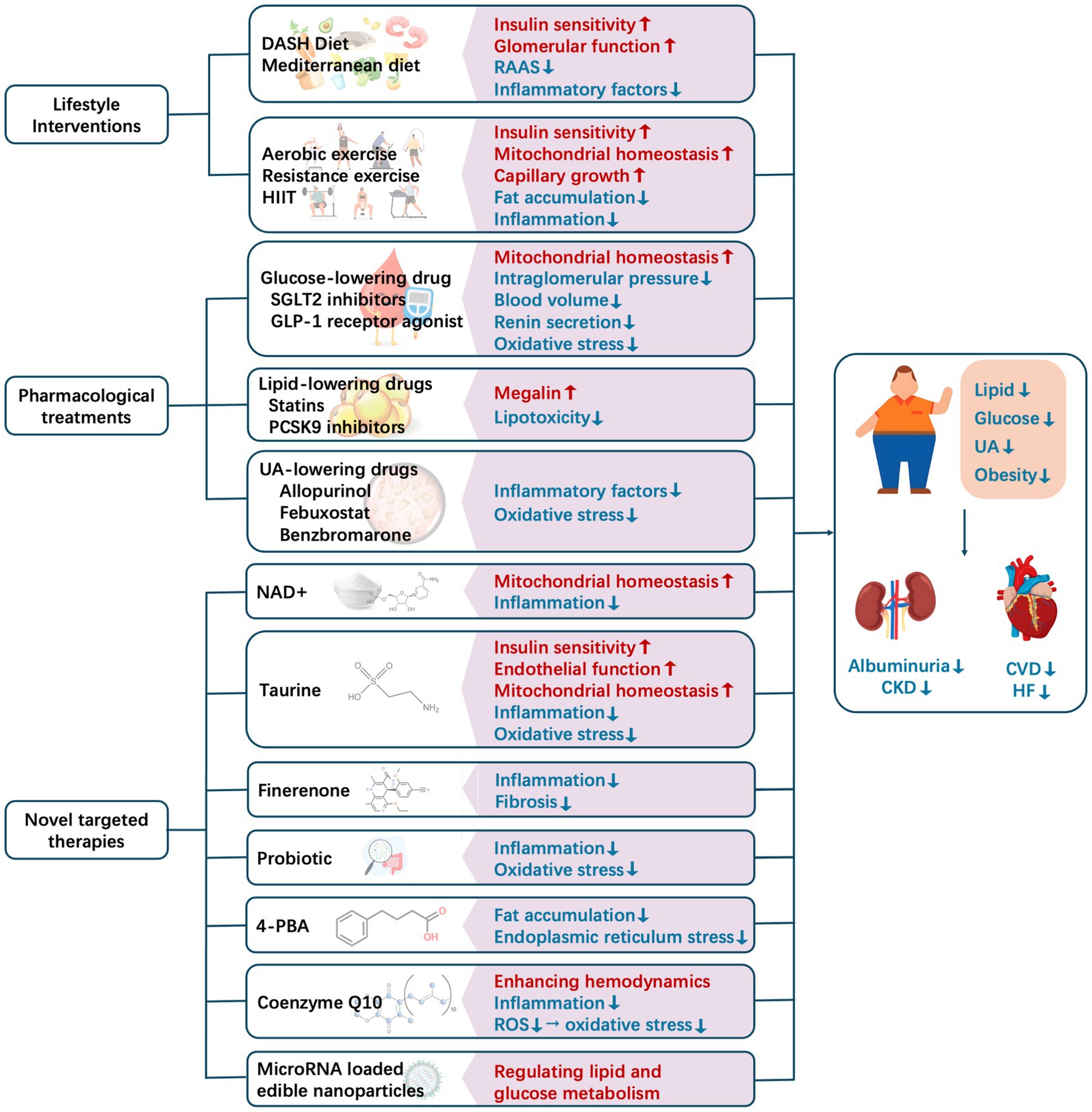 Figure 3. Current methods for intervening in and regulating metabolic conditions to improve cardiorenal outcomes. CKD, chronic kidney disease; CVD, cardiovascular disease; DASH, Dietary Approach to Stop Hypertension; HF, heart failure; HIIT, high-intensity interval training; NAD+, nicotinamide adenine nucleotide; RAAS, renin–angiotensin–aldosterone system; ROS, reactive oxygen species; UA, uric acid.