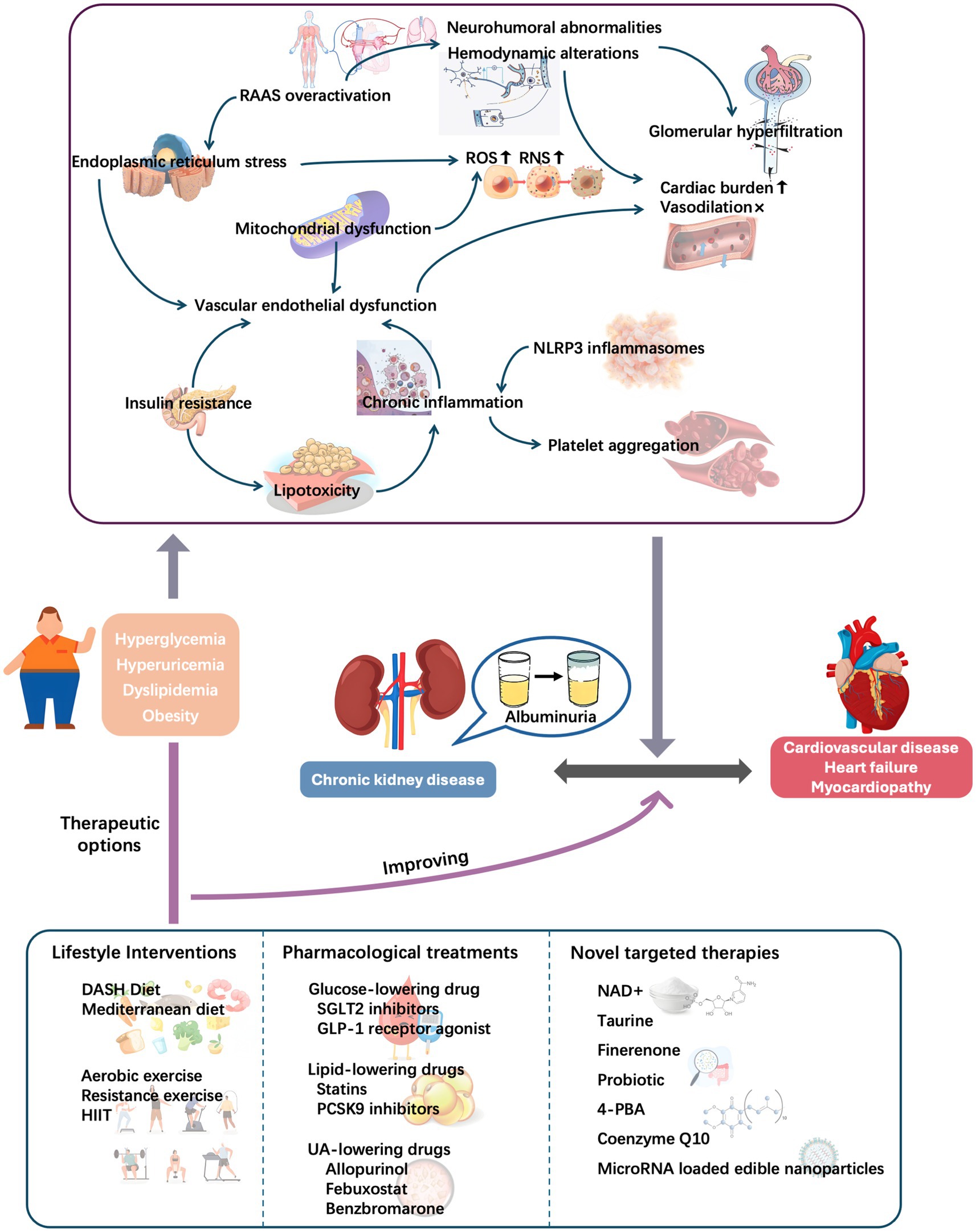 Figure 4. Role of metabolic conditions in cardiorenal diseases: Initiating pathways and therapeutic targeting. DASH, Dietary Approach to Stop Hypertension; HIIT, high-intensity interval training; NAD+, nicotinamide adenine nucleotide; NLRP3, nodular receptor protein 3; RAAS, renin–angiotensin–aldosterone system; RNS, reactive nitrogen species; ROS, reactive oxygen species; UA, uric acid.