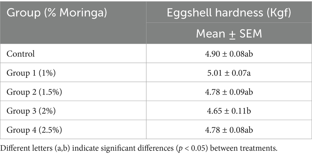 The reduction in eggshell hardness observed in the 2% group (Group 3, 4.65 ± 0.11 Kgf) compared to the 1 and 2.5% groups suggests a non-linear dose–response relationship, possibly related to calcium-to-phosphorus ratio disruption at intermediate concentrations. The recovery of hardness values at 2.5% (4.78 ± 0.08 Kgf) indicates that higher inclusion rates reestablish optimal mineral balance, supporting Garcia et al. (22) findings that Moringa’s phytogenic compounds benefit calcium storage and uterine physiology at appropriate dosages (22).
