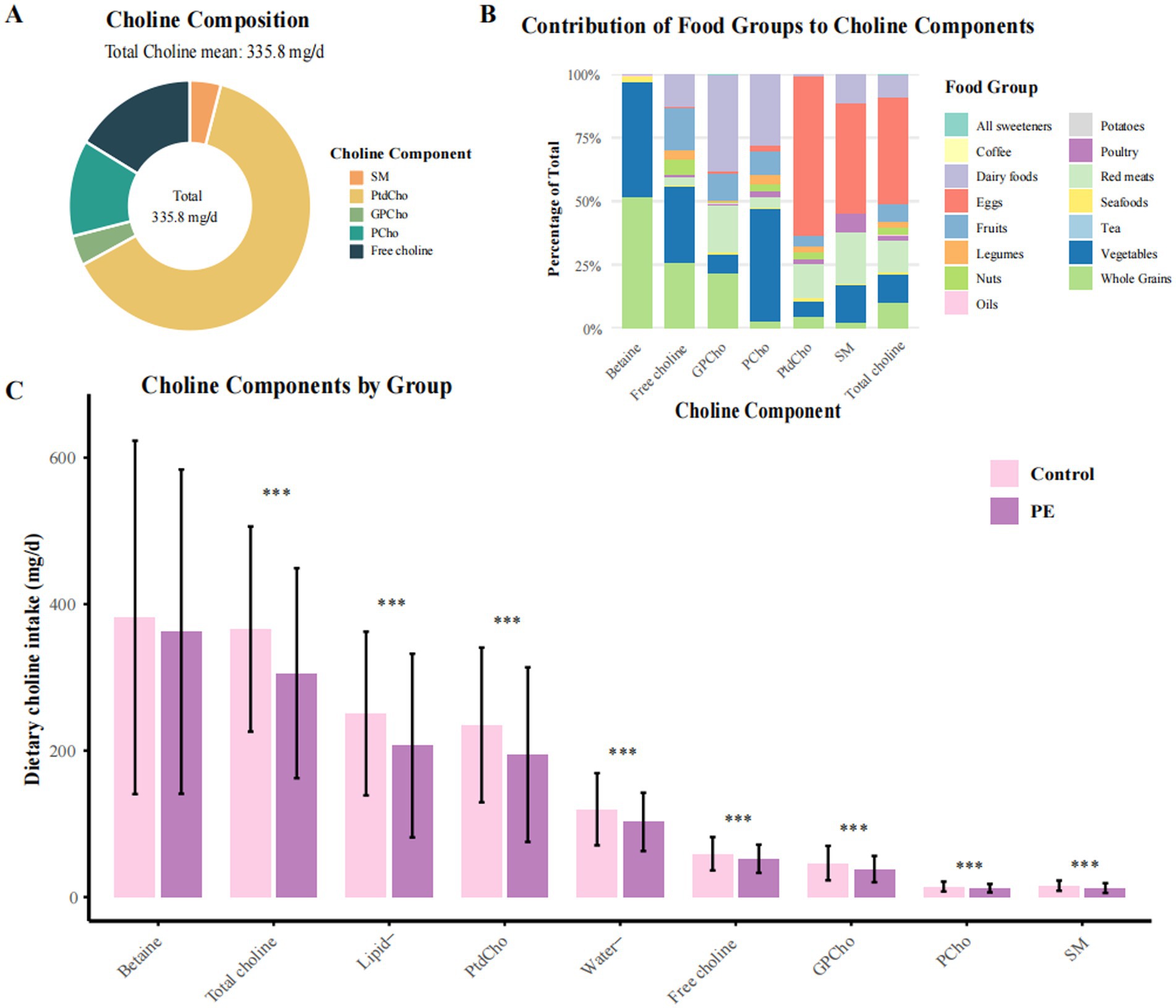 Figure 1. Distribution and food source composition of dietary choline and betaine intake among preeclampsia cases and controls. PE, preeclampsia; PtdCho, phosphatidylcholine; SM, sphingomyelin; GPCho, glycerophosphocholine; PCho, phosphocholine. (A) Composition of total dietary choline intake among all participants. In this study population, the average total choline intake was 335.1 mg/day. (B) Relative contributions of major food groups to total dietary choline and betaine intake. Eggs constituted the predominant dietary source of choline, accounting for 42.48% of total intake. (C) Comparative distribution of lipid-soluble and water-soluble choline, as well as betaine intake, between women with preeclampsia and controls. Lipid-soluble choline includes PtdCho and SM; water-soluble choline includes free choline, GPCho, and PCho. Values are presented as means, with error bars denoting standard deviations (± SD). *p < 0.05, **p < 0.01, ***p < 0.001 for group comparisons.