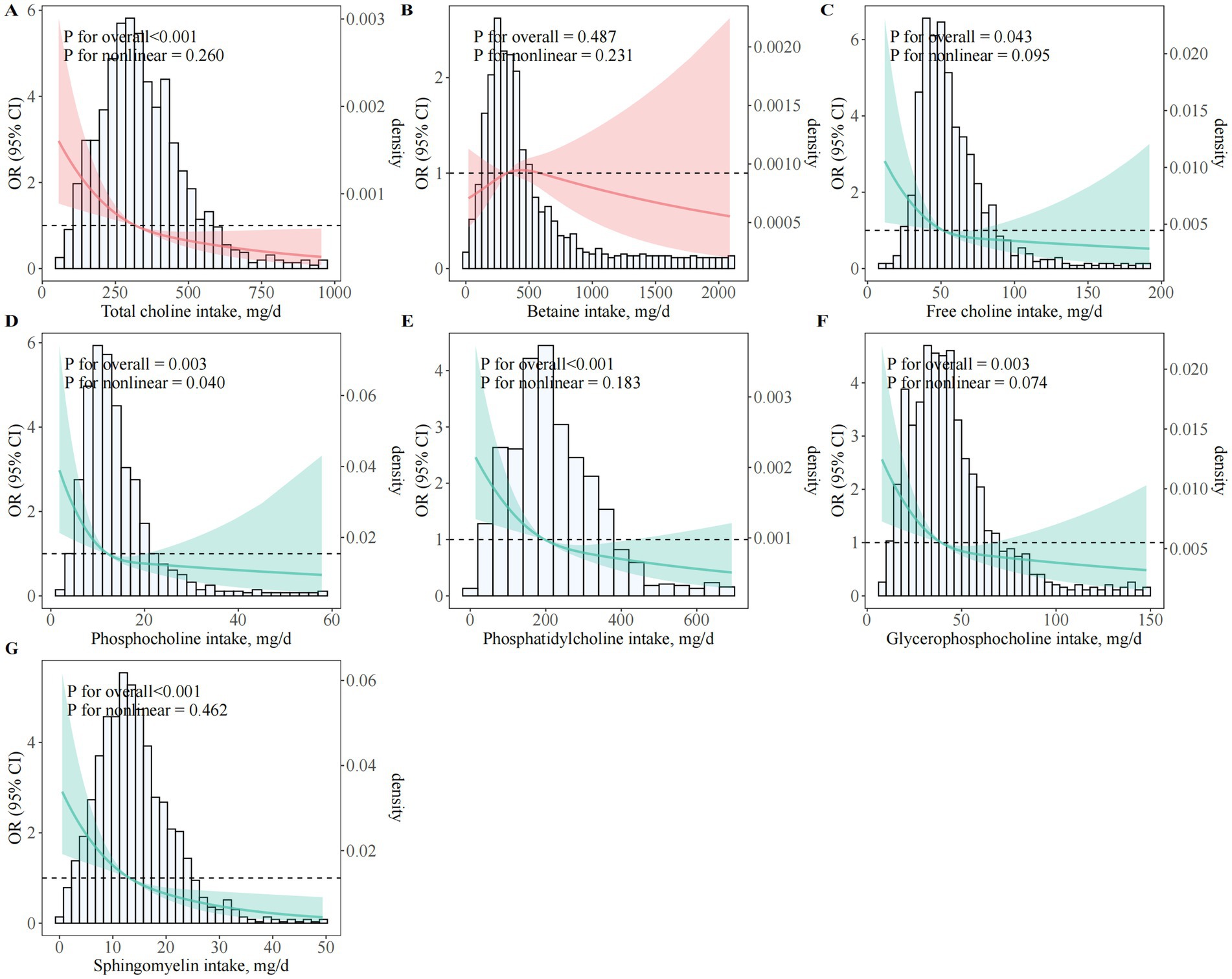 Figure 2. Dose–response associations between choline and betaine intake and odds of preeclampsia. (A)Total choline; (B) Betaine; (C) Free choline; (D) PCho; (E) PtdCho; (F) GPCho; (G) SM; OR, odds ratio; CI, confidence interval; BMI, body mass index; GDM, gestational diabetes mellitus; PCho, phosphocholine; GPCho, glycerophosphocholine; PtdCho, phosphatidylcholine; SM, sphingomyelin. Restricted cubic spline regression models illustrating multivariable-adjusted dose–response relationships between various forms of dietary choline and betaine intake and the odds of PE among pregnant women. All models were adjusted for maternal age (years), gestational age at survey (weeks), pre-pregnancy BMI (kg/m2), monthly household income, educational attainment, physical activity (MET-hours/day), employment status, smoking status, alcohol consumption, sleep quality, daily energy intake (kcal/day), season of dietary assessment, parity, GDM, menstrual regularity, family history of hypertension, and supplement use (folic acid and multivitamins).