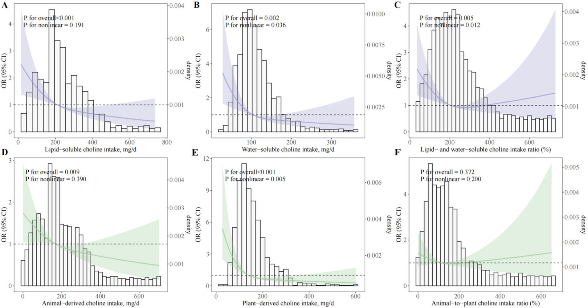 Figure 3. Dose–response associations between choline subtypes and sources and odds of preeclampsia. (A) Lipid-soluble choline (sum of PtdCho and SM); (B) Water-soluble choline (sum of free choline, GPCho, and PCho); (C) Ratio of lipid- to water-soluble choline intake; (D) Animal-derived choline intake; (E) Plant-derived choline intake; (F) Animal-to-plant choline intake ratio. OR, odds ratio; CI, confidence interval; BMI, body mass index; GDM, gestational diabetes mellitus; PCho, phosphocholine; GPCho, glycerophosphocholine; PtdCho, phosphatidylcholine; SM, sphingomyelin. Restricted cubic spline regression models depicting multivariable-adjusted dose–response relationships between various forms and dietary sources of choline intake and the odds of PE among pregnant women. All models were adjusted for maternal age (years), gestational age at survey (weeks), pre-pregnancy BMI (kg/m2), monthly household income, educational attainment, physical activity (MET-hours/day), employment status, smoking status, alcohol consumption, sleep quality, daily energy intake (kcal/day), season of dietary assessment, parity, GDM, menstrual regularity, family history of hypertension, and supplement use (folic acid and multivitamins).