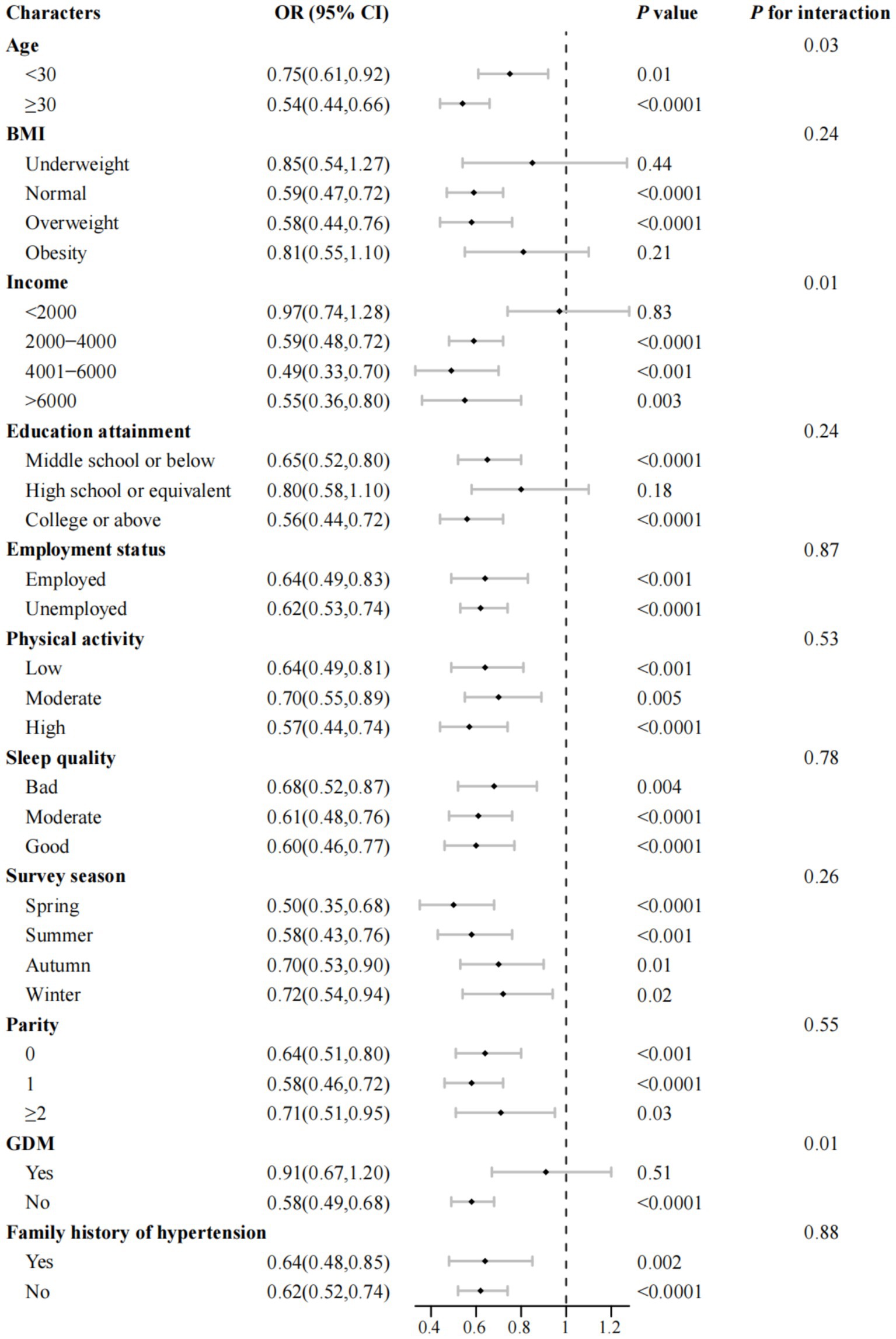 Figure 4. Association between total dietary choline intake and odds of preeclampsia across subgroups of maternal characteristics (n = 982). OR, odds ratio; CI, confidence interval; BMI, body mass index; GDM, gestational diabetes mellitus. Multivariable-adjusted ORs and corresponding 95% CIs for preeclampsia are presented per one standard deviation increase in total dietary choline intake, stratified by key maternal and lifestyle characteristics. All models were adjusted for maternal age group, gestational age at survey (weeks), pre-pregnancy BMI group, monthly household income, educational attainment, physical activity (MET-hours/day), employment status, smoking status, alcohol consumption, sleep quality, daily energy intake (kcal/day), season of dietary assessment, parity, GDM, menstrual regularity, family history of hypertension, and supplement use (folic acid and multivitamins), with the stratification variable excluded from each respective model. Point estimates (squares) indicate adjusted ORs, with error bars representing 95% CIs. p values for interaction were derived from likelihood ratio tests and are presented without adjustment for multiple comparisons.