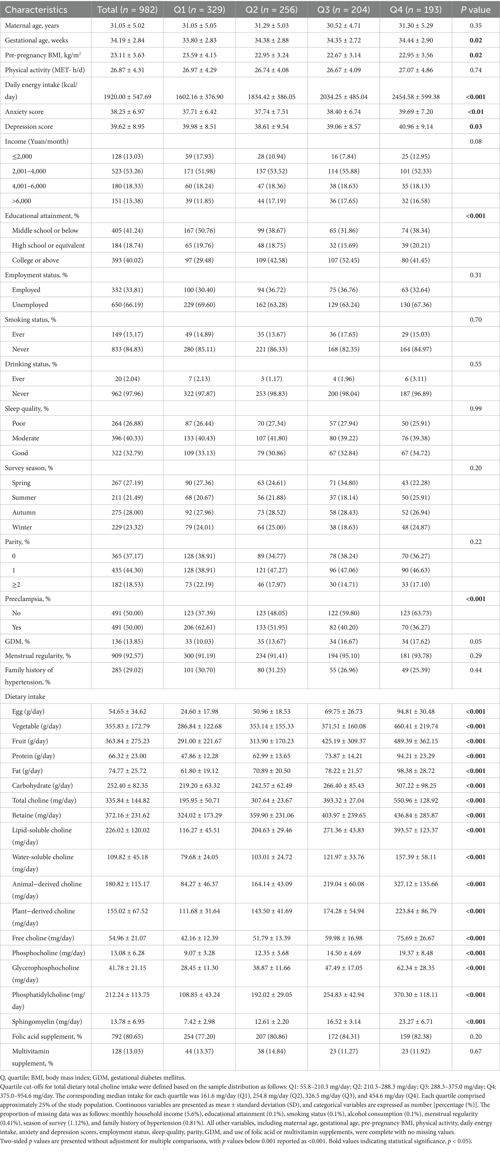 PE diagnosis followed the 2015 Chinese guidelines (21), requiring new-onset hypertension (≥140/90 mmHg) after 20 weeks’ gestation accompanied by either proteinuria (≥0.3 g/24 h) or evidence of organ dysfunction. Eligible participants were pregnant women aged 18–45 years with singleton pregnancies and no history of gestational hypertension. Each case was individually matched to a control based on maternal age (±3 years), gestational age (±1 week), and gestational diabetes mellitus (GDM) status. Exclusion criteria included chronic hypertension, diabetes, renal or psychiatric disease, and implausible energy intake (<500 or >5,000 kcal/day). Of the 1,218 women screened, 491 matched pairs (n = 982) were included in the final analysis (Supplementary Figure 1). Power calculations indicated that the sample size provided 80% power (α = 0.05) to detect an odds ratio of 0.50 for high versus low choline intake (22). The study was approved by the Ethics Committee of the First Affiliated Hospital of Zhengzhou University (No. Scientific research-2016-LW-34), and all participants provided written informed consent.