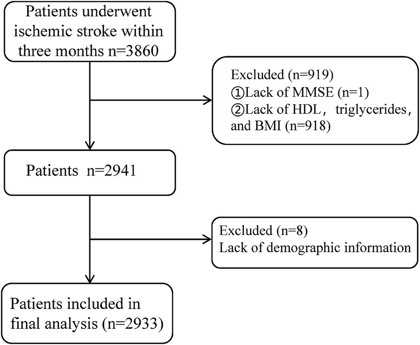 Flowchart showing patient selection for analysis. Initially, 3,860 patients underwent ischemic stroke within three months. Exclusions include 919 patients for lack of MMSE, HDL, triglycerides, and BMI, and 8 for missing demographic data. 2,933 patients were included in the final analysis.