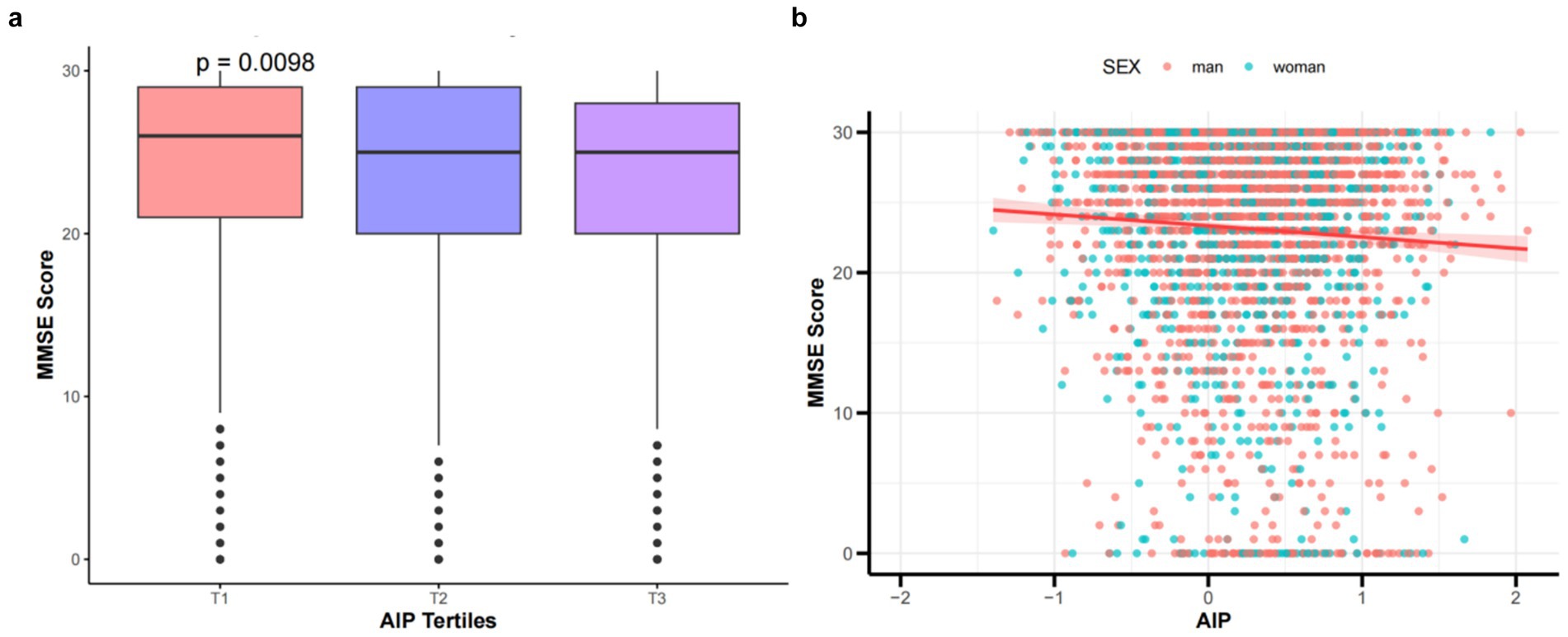 Boxplot and scatter plot of MMSE score versus AIP. The boxplot on the left (a) displays MMSE scores across AIP tertiles (T1, T2, T3) with a p-value of 0.0098 above T1. The scatter plot on the right (b) shows MMSE scores plotted against AIP scores, differentiated by color for men and women, with a negative trend line.