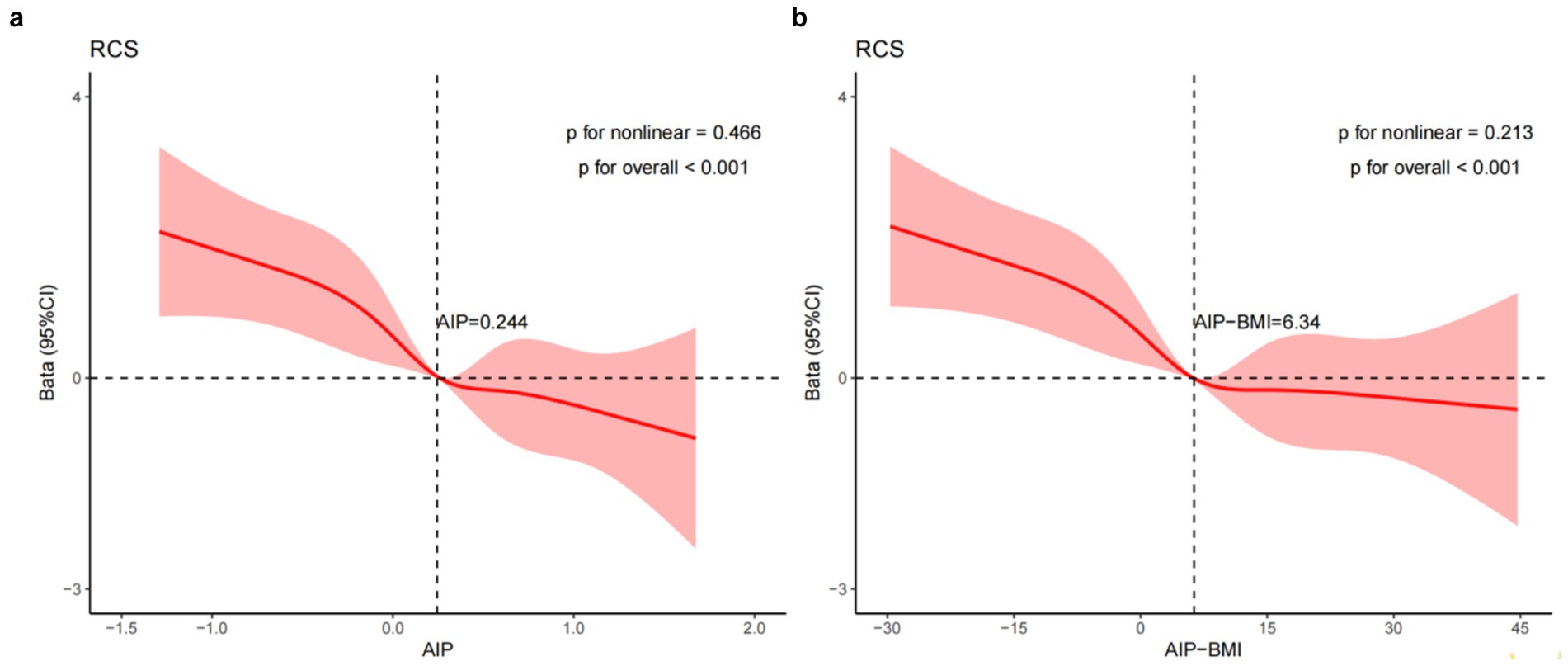 Figure 3. RCS illustrates the relationships between the AIP (a) and AIP-BMI (b) with MMSE scores, fitted using a linear regression model. This model was adjusted for age, education, smoking status, LDL-C, duration of illness, family history of HTN, the presence of HTN, AF, and OCSP classification (TACI and LACI). The solid line represents the estimated values, while the shaded area indicates the 95% confidence interval. In (a) presents the X-axis, which denotes the AIP. In (b), the X-axis indicates the AIP-BMI, while the Y-axis represents the β coefficient.