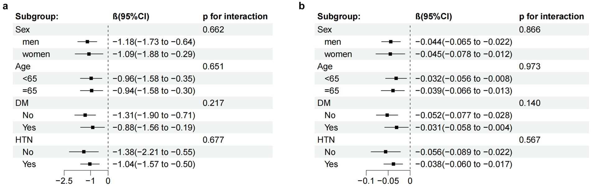 Two forest plots labeled 'a' and 'b' display subgroup analyses with beta coefficients and confidence intervals. Subgroups include sex, age, diabetes mellitus (DM), and hypertension (HTN), comparing men, women, under 65, and over 65 demographics, with p-values for interaction. Both plots feature a range of beta values and confidence intervals, indicating variation in subgroup effects. Plot 'a' values generally range from -2.5 to 0, while plot 'b' ranges from -0.1 to 0.