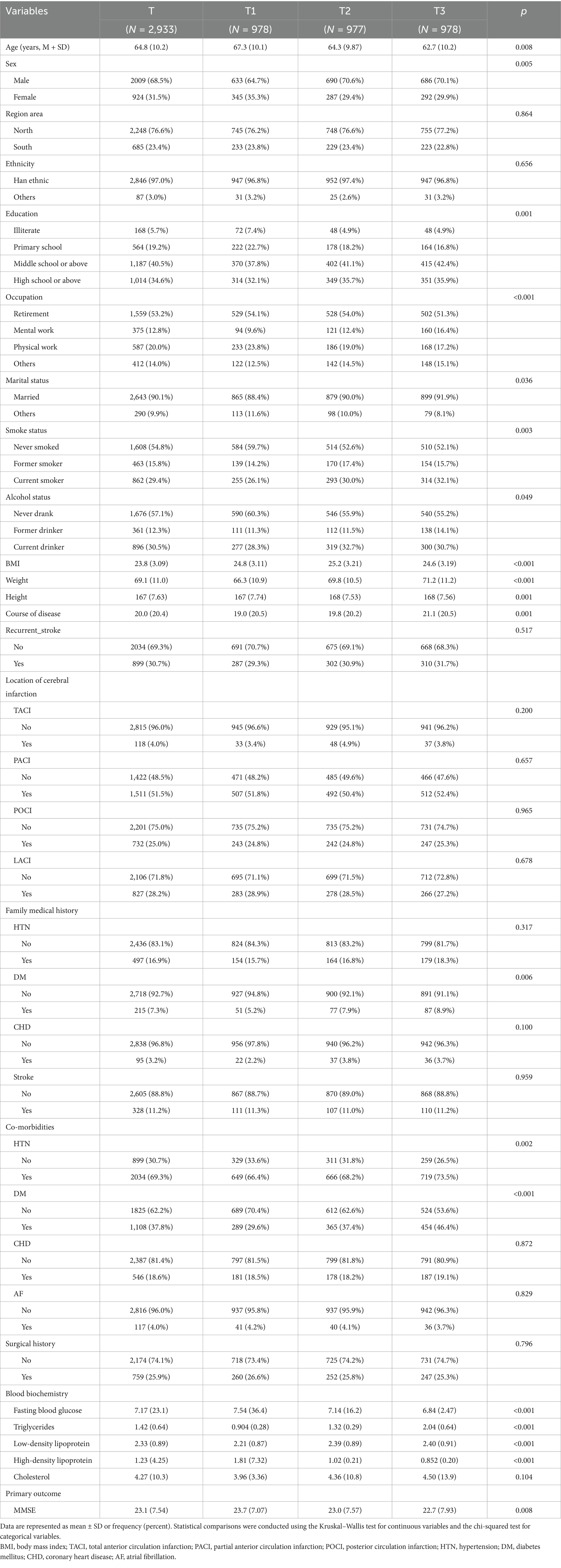 This study initially included 3,860 patients diagnosed with ischemic stroke. After excluding 927 cases due to extreme outlier measurements and missing data, a total of 2,933 patients were ultimately included. Continuous missing data were predicted and imputed using a linear regression model. The average age of the included patients was 64.8 years, with 2,009 men (68.5%) and 924 women (31.5%). Group T1 (AIP < 0.011) comprised 978 patients, Group T2 (0.011 ≤ AIP < 0.499) included 977 patients, and Group T3 (AIP ≥ 0.499) consisted of 978 patients (see Table 1).