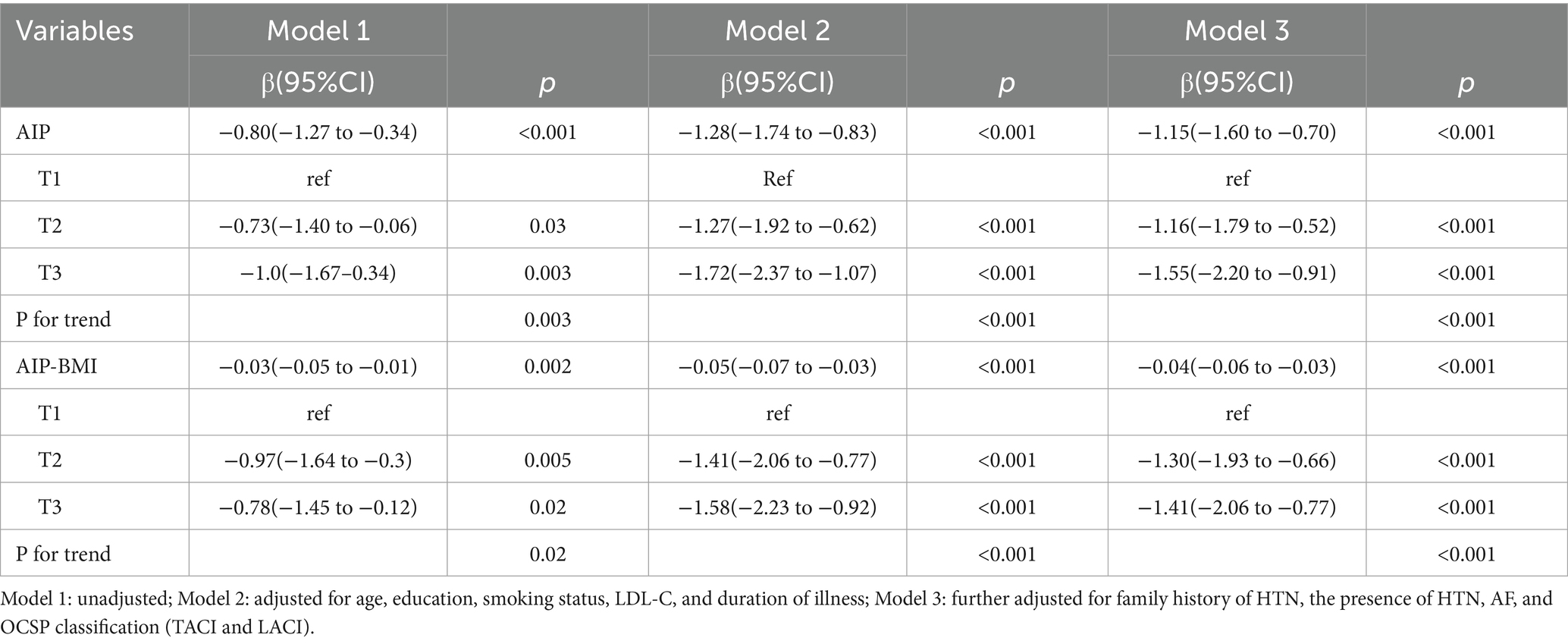 Table 2. Linear regression analysis of the AIP and AIP-BMI in relation to cognitive function in patients with ischemic stroke.