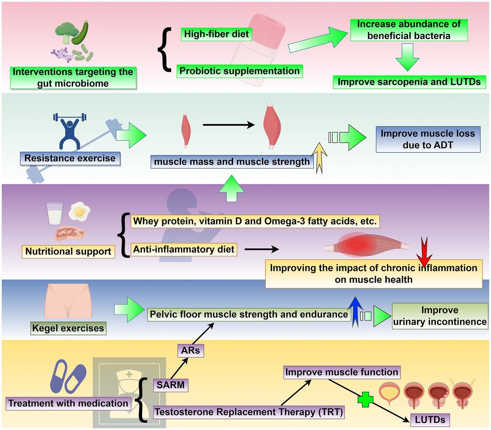 Figure 2. Targeted sarcopenia therapy for potential treatment methods of LUTDs: This schematic outlines a comprehensive set of strategies to address sarcopenia and its associated LUTDs. The interventions include: (1) resistance exercise: Progressive resistance training enhances muscle mass and strength, effectively reversing muscle loss associated with androgen deprivation therapy (ADT) and serving as a non-pharmacological approach to mitigate LUTD-related dysfunction. (2) Nutritional support: Supplementation with whey protein, vitamin D, omega-3 fatty acids, and adherence to an anti-inflammatory diet improve muscle health by countering chronic inflammation and promoting muscle synthesis, with implications for LUTD management. (3) Interventions targeting the gut microbiome: High-fiber diets and probiotic supplementation increase the abundance of beneficial bacteria, modulating systemic inflammation and metabolic pathways to concurrently improve sarcopenia and LUTDs. (4) Kegel exercises: Pelvic floor muscle training strengthens pelvic floor muscle strength and endurance, directly improving urinary incontinence and other LUTD symptoms. (5) Treatment with medication: Pharmacological strategies, including selective androgen receptor modulators (SARMs), androgen receptor (AR)-targeted agents, and testosterone replacement therapy (TRT), enhance muscle function by addressing androgen-related sarcopenia, subsequently alleviating LUTDs. Collectively, these interventions target sarcopenia through multiple pathways, with the potential to concurrently improve LUTD outcomes and enhance patient quality of life. This figure was drawn by Figdraw.com.