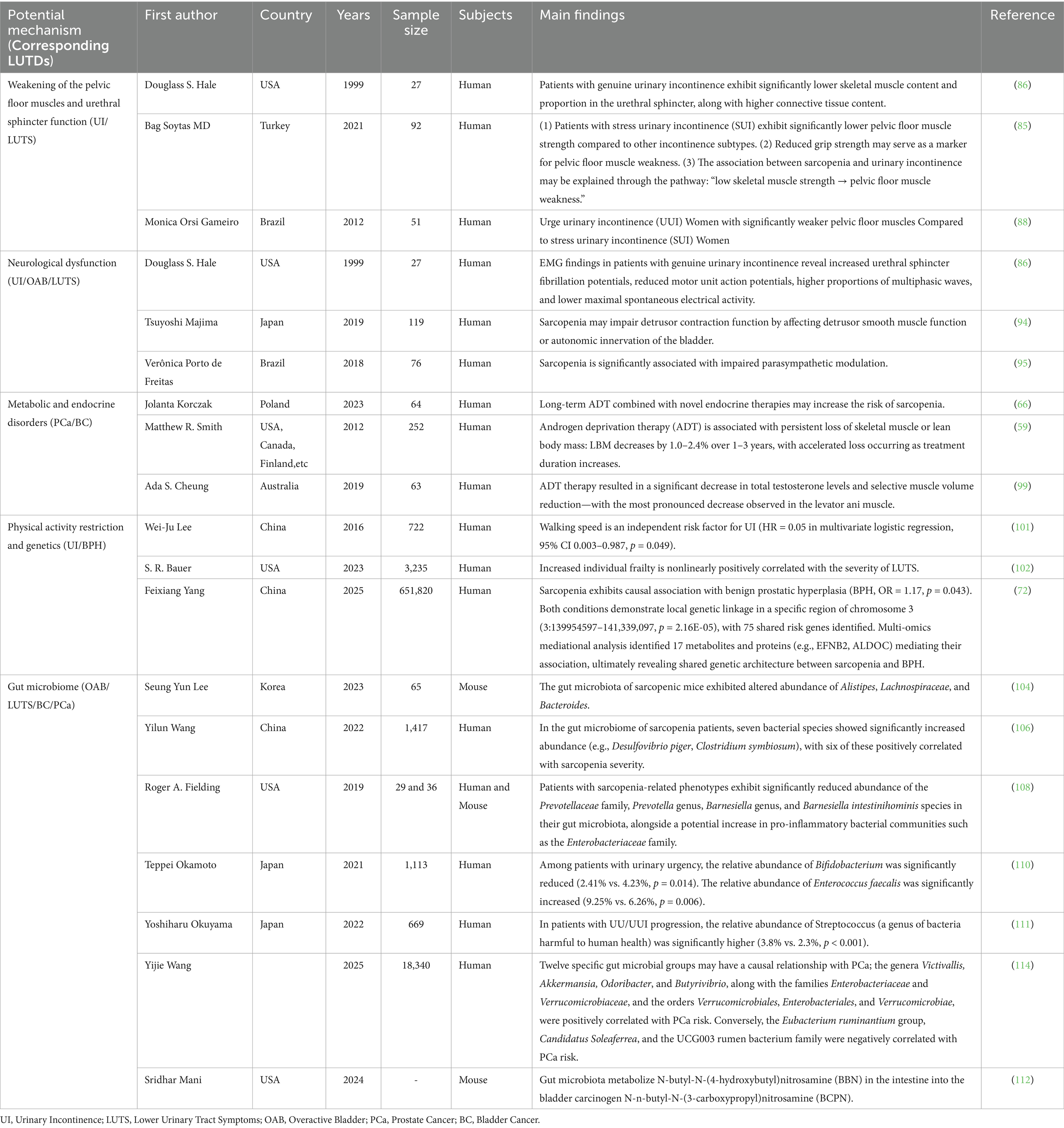 Table 1. Potential mechanisms and supporting evidence underlying the relationship between sarcopenia and LUTDs.