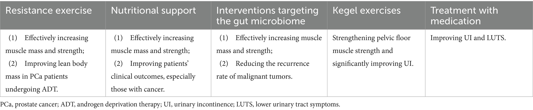 In summary, the association between sarcopenia and LUTDs is not the result of a single mechanism, but is mediated through a multidimensional pathway of pelvic floor muscle and urethral sphincter weakening, neuromuscular dysfunction, metabolic disorders, limited physical activity, genetic factors, or the gut microbiome, ranging from insufficient structural muscle support, to impaired neural signaling, to indirect effects of intestinal bacteria through inflammatory and metabolic pathways. These mechanisms not only reveal the complexity of the interaction between the two, but also identify the core targets for clinical intervention - whether it is repairing muscle function, regulating metabolic status, or improving intestinal microecology, all of them should be centered on the key links in the mechanisms. Based on the scientific support of the above mechanisms, intervention for LUTDs has become an important breakthrough to improve the symptoms and optimize the prognosis of LUTDs, and a number of intervention strategies have already demonstrated their potentials in clinical research, covering the fields of exercise training, nutritional regulation, intestinal bacterial targeting intervention, local muscle rehabilitation, and pharmacological treatment, etc. In the following section, we will systematically elaborate the specific implementation plan, effect and clinical application value of these strategies. In the following, we will systematically describe the implementation, effect and clinical value of these strategies.