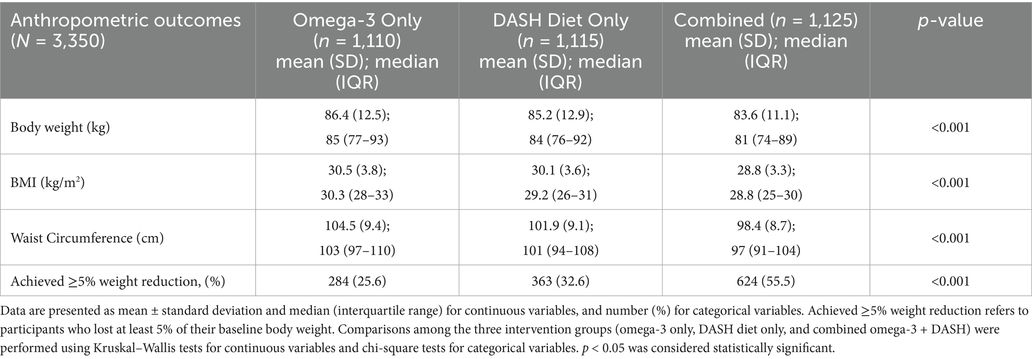 Anthropometric measurements are physical assessments of body size, shape, and composition, such as height, weight, BMI, and waist circumference. At the 24-month follow-up, participants in the combined Omega-3 and DASH diet group exhibited the most significant improvements in anthropometric measures compared to those in the Omega-3 only and DASH diet only groups. The mean body weight was lowest in the combined group (83.6 ± 11.1 kg; median 81 kg, IQR 74–89), followed by the DASH diet only group (85.2 ± 12.9 kg; median 84 kg, IQR 76–92), and the Omega-3 only group (86.4 ± 12.5 kg; median 85 kg, IQR 77–93) (p < 0.001). Similarly, the mean BMI was lowest in the combined group (28.8 ± 3.3 kg/m2; median 28.8 kg/m2, IQR 25–30), compared to the DASH diet only group (30.1 ± 3.6 kg/m2; median 29.2 kg/m2, IQR 26–31), and the Omega-3 only group (30.5 ± 3.8 kg/m2; median 30.3 kg/m2, IQR 28–33) (p < 0.001). Waist circumference also showed the greatest reduction in the combined group (98.4 ± 8.7 cm; median 97 cm, IQR 91–104), followed by the DASH diet only group (101.9 ± 9.1 cm; median 101 cm, IQR 94–108), and the Omega-3 only group (104.5 ± 9.4 cm; median 103 cm, IQR 97–110) (p < 0.001). Notably, the combined intervention group achieved the highest proportion of participants with ≥5% weight reduction (55.5%), compared to 32.6% in the DASH diet only group and 25.6% in the Omega-3 only group (p < 0.001) (Table 4).