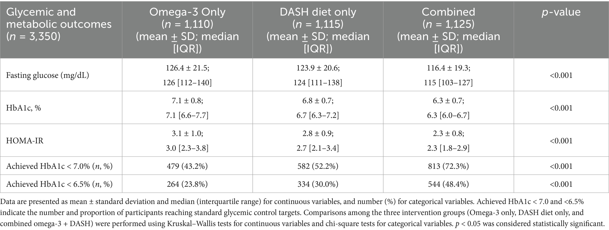 Glycemic and metabolic outcomes refer to the effects of diet or interventions on blood sugar control, insulin response, and overall metabolic health. Participants in the combined Omega-3 supplementation and DASH diet group showed the most substantial improvements in glycemic and metabolic parameters compared with the Omega-3 only and DASH-only groups. The mean fasting glucose was lowest in the combined group (116.4 ± 19.3 mg/dL; median 115 mg/dL, IQR 103–127), compared with 126.4 ± 21.5 mg/dL in the Omega-3 only group and 123.9 ± 20.6 mg/dL in the DASH-only group (p < 0.001). Similarly, mean HbA1c was lowest in the combined group (6.3 ± 0.7%; median 6.3%, IQR 6.0–6.7) versus 7.1 ± 0.8% in the Omega-3 group and 6.8 ± 0.7% in the DASH-only group (p < 0.001). Insulin resistance, measured by HOMA-IR, was also significantly reduced in the combined group (2.3 ± 0.8; median 2.3, IQR 1.8–2.9) compared with the Omega-3 only (3.1 ± 1.0) and DASH-only groups (2.8 ± 0.9; p < 0.001). The combined group had the largest proportion of patients meeting target HbA1c levels, with 72.3% obtaining <7.0 and 48.4% achieving <6.5%, compared to 43.2 and 23.8% in the Omega-3 only group and 52.2 and 30.0% in the DASH-only group (p < 0.001) (Table 5).