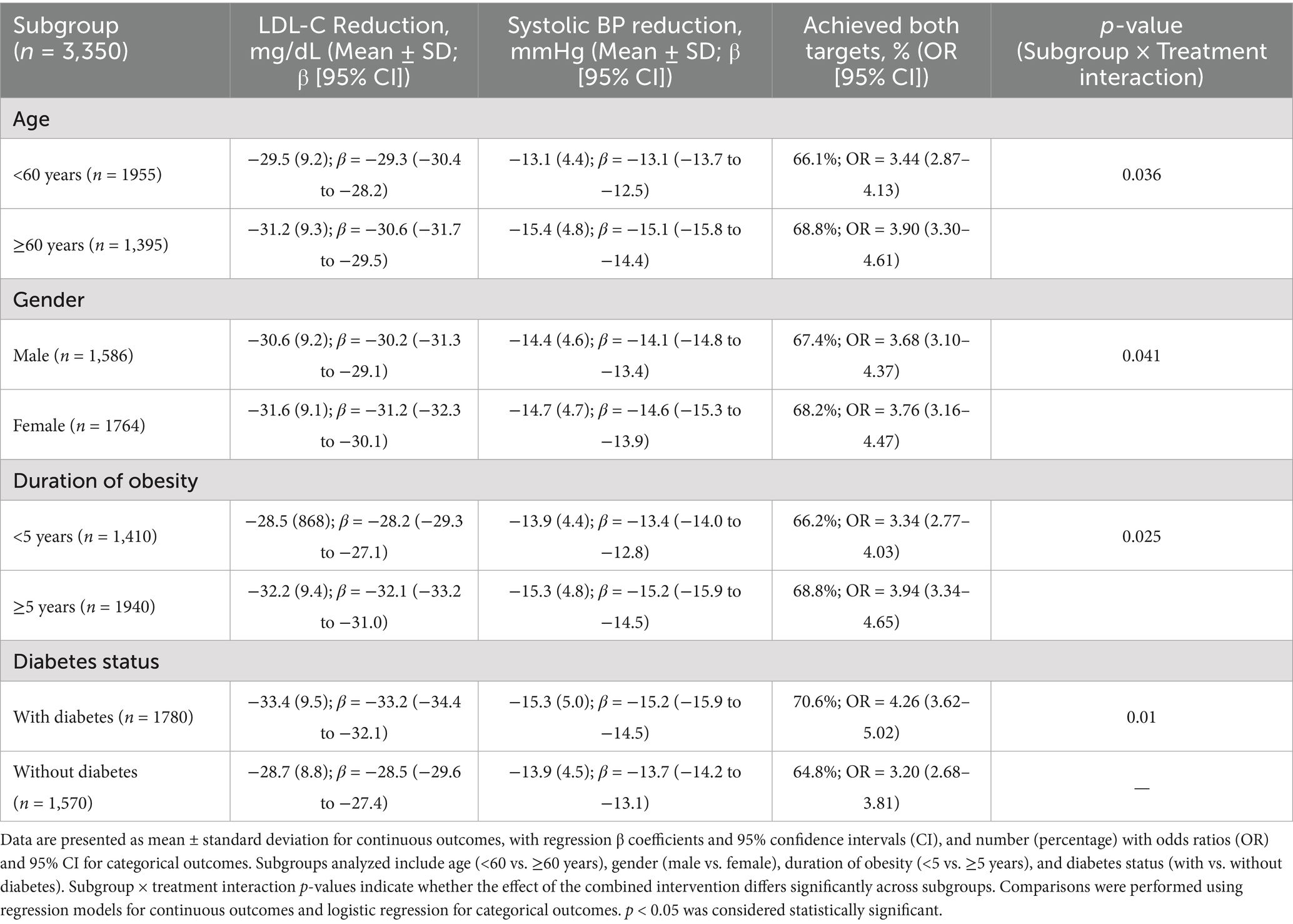 Omega-3 supplementation and DASH diet intervention reduced LDL-C, systolic blood pressure, and met both targets in all categories, with considerable variation in degree. Participants aged ≥60 years experienced slightly greater LDL-C reduction (−31.2 ± 9.3 mg/dL; β = −30.6, 95% CI –31.7 to −29.5) and systolic BP reduction (−15.4 ± 4.8 mmHg; β = −15.1, 95% CI –15.8 to −14.4) compared with those <60 years, and a higher proportion achieved both targets (68.8% vs. 66.1%; OR = 3.90 vs. 3.44; interaction p = 0.036). Gender-based analysis showed slightly greater improvements among females, with LDL-C reduction of −31.6 ± 9.1 mg/dL (β = −31.2, 95% CI –32.3 to −30.1) and systolic BP reduction of −14.7 ± 4.7 mmHg (β = −14.6, 95% CI –15.3 to −13.9), resulting in 68.2% achieving both targets (OR = 3.76; interaction p = 0.041). Duration of obesity influenced outcomes, with participants obese ≥5 years demonstrating larger LDL-C reductions (−32.2 ± 9.4 mg/dL; β = −32.1, 95% CI –33.2 to −31.0) and systolic BP decreases (−15.3 ± 4.8 mmHg; β = −15.2, 95% CI –15.9 to −14.5) compared with those obese <5 years, and a higher proportion achieving both targets (68.8% vs. 66.2%; interaction p = 0.025). Diabetes status was a strong modifier of intervention effectiveness: participants with diabetes achieved the greatest LDL-C reduction (−33.4 ± 9.5 mg/dL; β = −33.2, 95% CI –34.4 to −32.1), systolic BP reduction (−15.3 ± 5.0 mmHg; β = −15.2, 95% CI –15.9 to −14.5), and proportion achieving both targets (70.6%; OR = 4.26) compared with non-diabetic participants (64.8%; OR = 3.20; interaction p = 0.01) (Table 7).