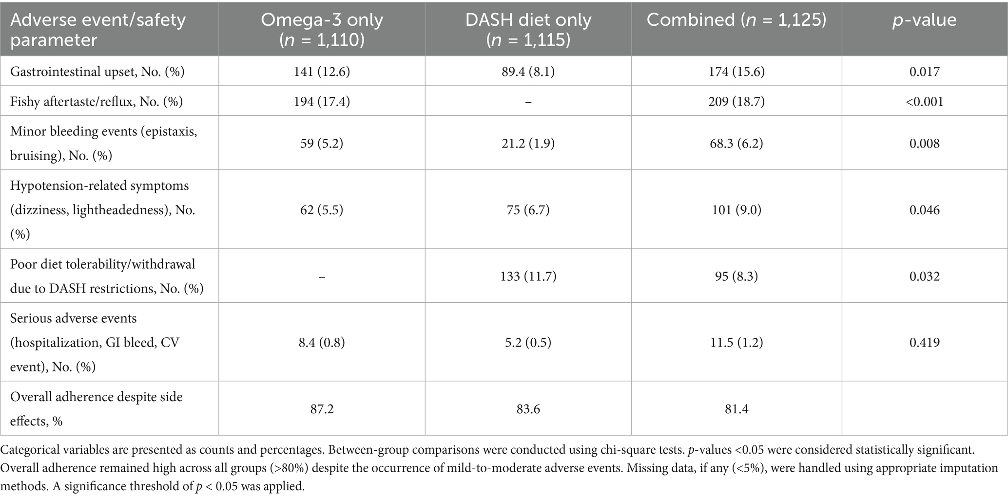 Adverse events and safety outcomes evaluate the risks, side effects, and overall tolerability of omega-3 and DASH diet interventions. Table 9 summarizes adverse events and safety outcomes for participants receiving omega-3 supplementation, the DASH diet, or a combination of both interventions. Gastrointestinal upset was reported in 12.6% of the omega-3 group, 8.1% of the DASH diet group, and 15.6% of the combined group, showing a statistically significant difference (p = 0.017). Fishy aftertaste or reflux occurred in 17.4% of the omega-3 group and 18.7% of the combined group, with no data available for the DASH diet group, and this difference was highly significant (p < 0.001). Minor bleeding events were observed in 5.2% of the omega-3 group, 1.9% of the DASH diet group, and 6.2% of the combined group, with a significant difference across groups (p = 0.008). Hypotension-related symptoms were reported in 5.5% of the omega-3 group, 6.7% of the DASH diet group, and 9.0% of the combined group (p = 0.046). Poor diet tolerability or withdrawal due to DASH diet restrictions was 11.7% in the DASH diet group and 8.3% in the combined group, while not applicable to the omega-3 group, with a significant difference (p = 0.032). Hospitalization, gastrointestinal bleeding, and cardiovascular events were rare: 0.8% in the omega-3 group, 0.5% in the DASH diet group, and 1.2% in the combination group (p = 0.419). Omega-3 had 87.2% adherence, DASH 83.6%, and the combined group 81.4% despite adverse effects.