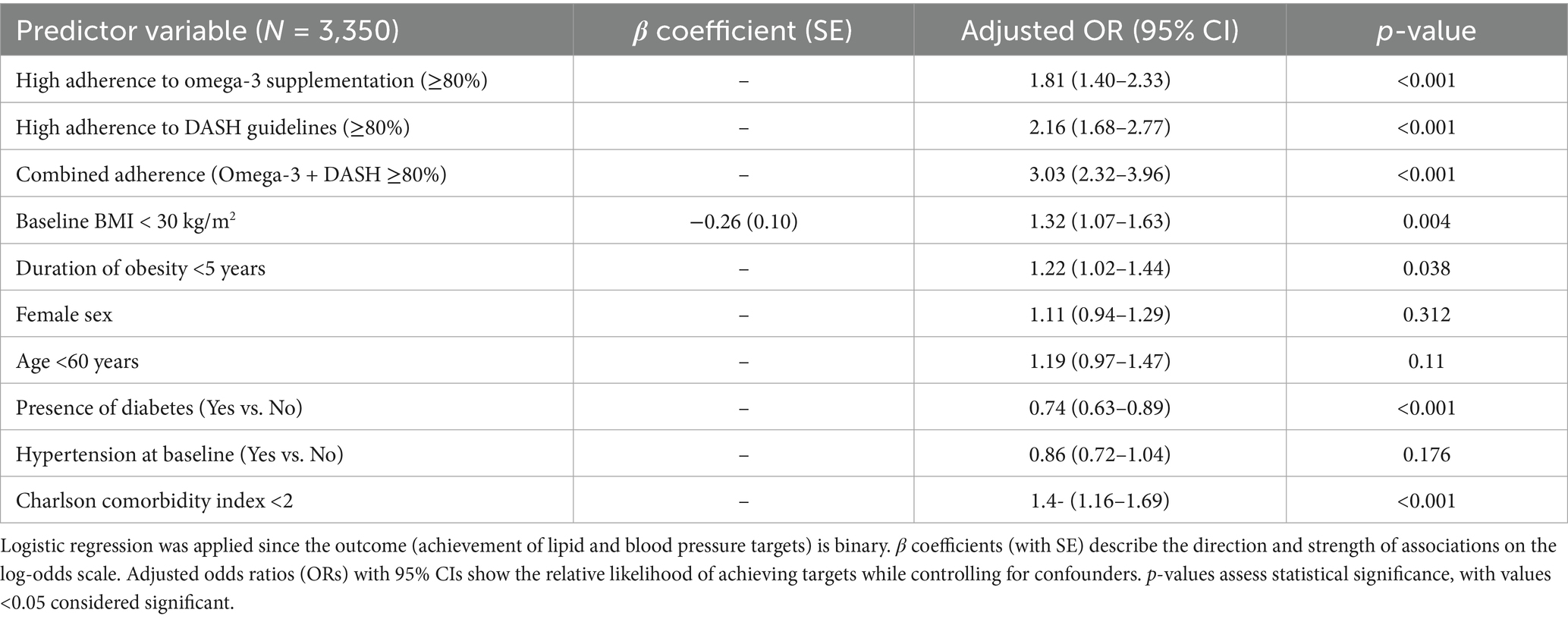 Multivariable regression showed that adherence considerably affects outcomes. High omega-3 supplementation adherence (≥80%) significantly enhanced odds of attaining cholesterol and blood pressure targets (OR: 1.81, 95% CI: 1.40–2.33, p < 0.001), while high DASH diet adherence alone had even greater odds (OR: 2.16, 95% CI: 1.68–2.77, p < 0.001) Adherence to both medications resulted in the best success rate (OR: 3.03, 95% CI: 2.32–3.96, p < 0.001). Among baseline characteristics, participants with BMI < 30 kg/m2 (β = −0.26, SE = 0.10; OR: 1.32, 95% CI: 1.07–1.63, p = 0.004), obesity duration <5 years (OR: 1.22, 95% CI: 1.02–1.44, p = 0.038), and a Charlson comorbidity index <2 (OR: 1.40, 95% CI: 1.16–1.69, p < 0.001) showed significantly greater odds of achieving targets. In contrast, female sex (OR: 1.11, 95% CI: 0.94–1.29, p = 0.312), younger age <60 years (OR: 1.19, 95% CI: 0.97–1.47, p = 0.11), and baseline hypertension (OR: 0.86, 95% CI: 0.72–1.04, p = 0.176) were not significant predictors. Diabetes was found to be negatively linked with outcomes (OR: 0.74, 95% CI: 0.63–0.89, p < 0.001), indicating a lower likelihood of achieving cholesterol and BP control (Table 10).