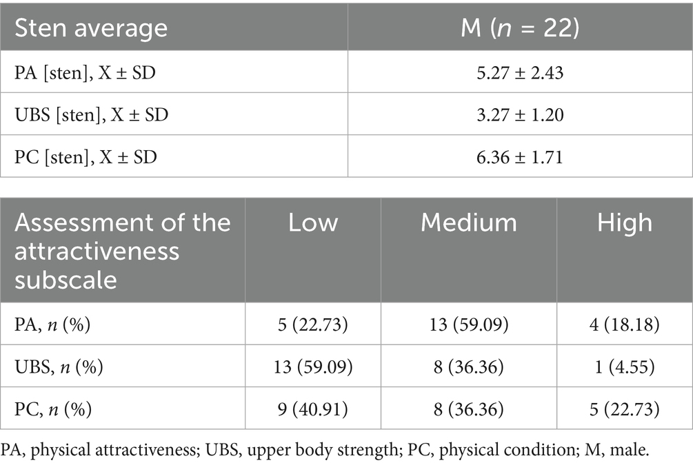 Among men, medium sten scores predominated for physical attractiveness (n = 13), while the greatest number recorded low scores for upper body strength (n = 13) and physical condition (n = 9).