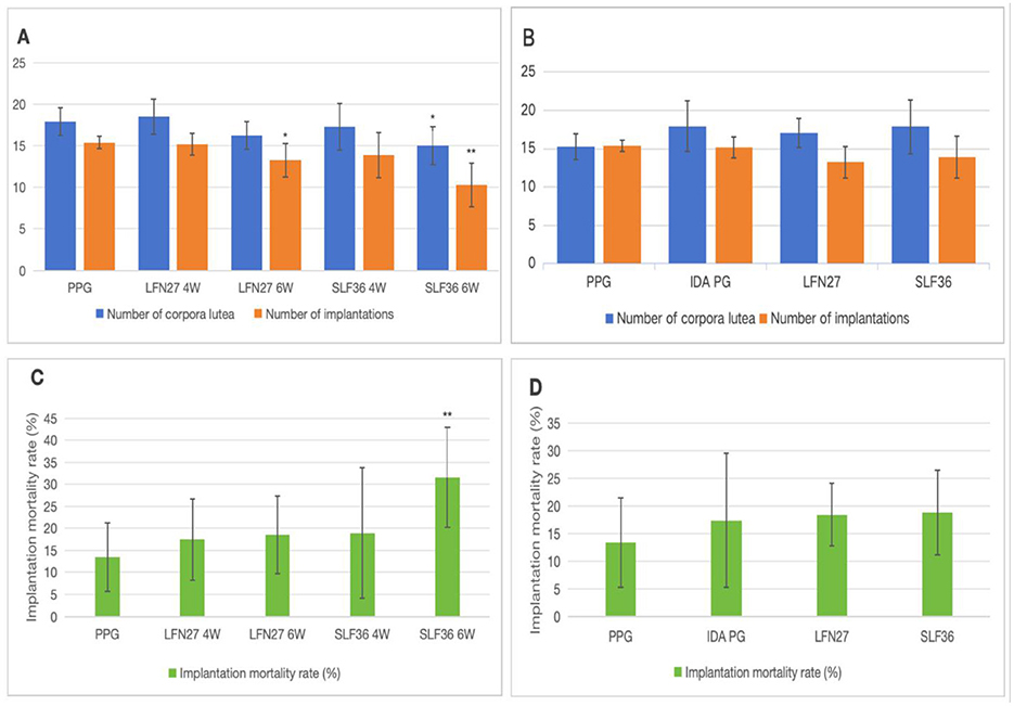 Figure 1. Effects of iron supplements on the fertility of pregnant anemia rats. (A, C) Physiological pregnancy anemia model. (B, D) Pregnancy anemia model after IDA. Compared with the physiological pregnancy group, *P < 0.05; **P < 0.01.