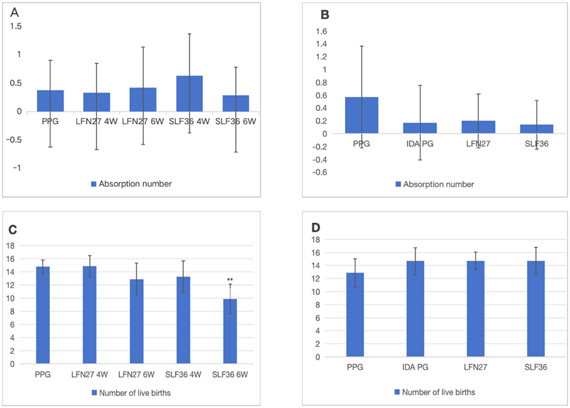 Figure 2. Effect of iron supplements on the number of embryos in pregnant anemic rats. (A, C) Physiological pregnancy anemia model. (B, D) Pregnancy anemia model after IDA. Compared with the physiological pregnancy group, **P < 0.01.
