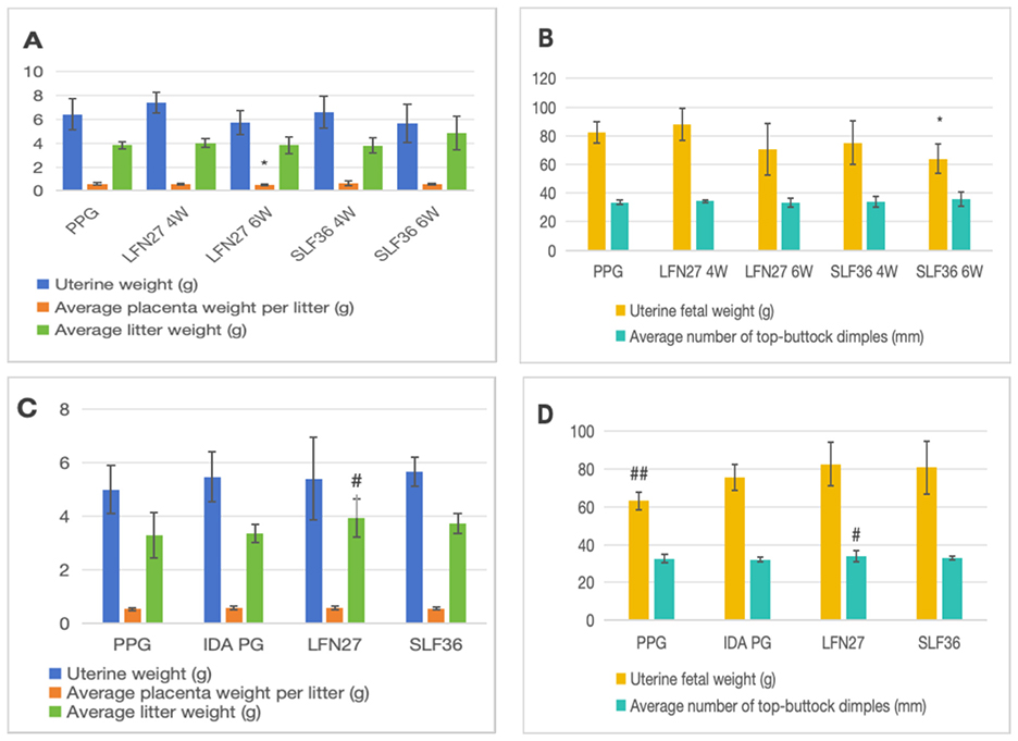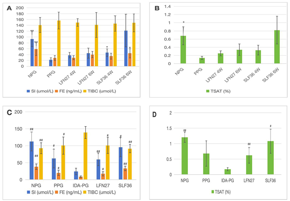 Figure 3. Effects of iron supplements on embryo and offspring development in pregnant anemia rats. (A, B) Physiological pregnancy anemia model. (C, D) Pregnancy anemia model after IDA. Compared with the physiological pregnancy group, *P < 0.05; compared with the IDA pregnancy group, #P < 0.05; ##P < 0.01.
