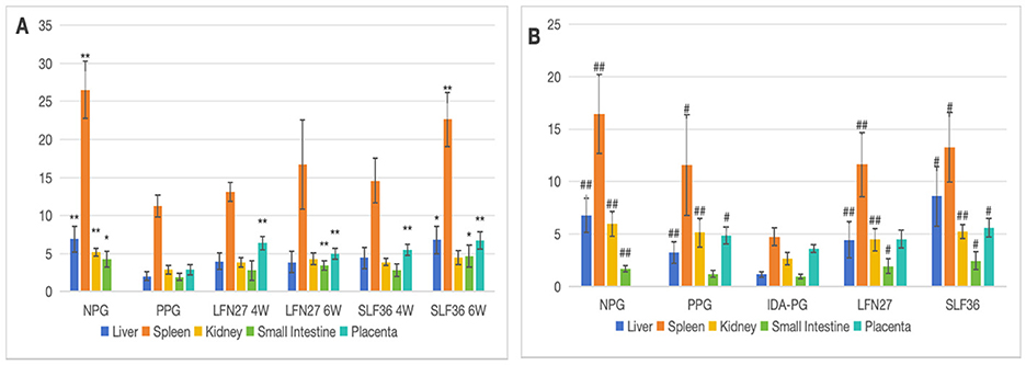 Figure 7. Effect of GD20 iron supplement on tissue iron content in pregnant anemic rats. (A) Physiological pregnancy anemia model. (B) Pregnancy anemia model after IDA. Compared with the physiological pregnancy group, *P < 0.05; **P < 0.01. Compared with the IDA pregnancy group, #P < 0.05; ##P < 0.01.