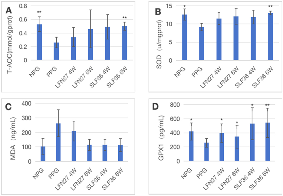Figure 8. Effects of GD20 iron supplement on liver oxidative stress related indicators in physiological pregnancy group. (A) T-AOC; (B) SOD; (C) MDA; (D) GPX1. Compared with the physiological pregnancy group, *P < 0.05; **P < 0.01.