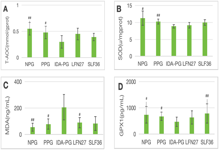 Figure 9. Effects of GD20 iron supplement on liver oxidative stress related indicators in pregnancy anemia model after IDA. (A) T-AOC; (B) SOD; (C) MDA; (D) GPX1. Compared with the IDA pregnancy group, #P < 0.05; ##P < 0.01.