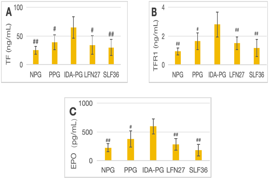 Figure 11. Effects of LFN and SLF on serum iron metabolism-related indicators in pregnancy anemia model after IDA. (A) TF; (B) TFR1; (C) EPO. Compared with the IDA pregnancy group, #P < 0.05; ##P < 0.01.