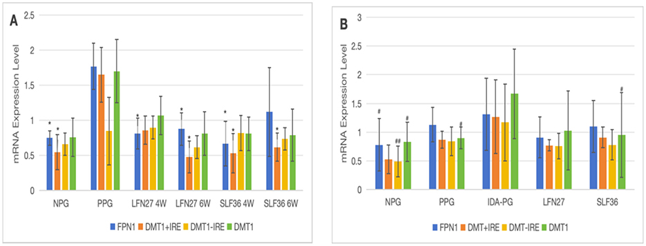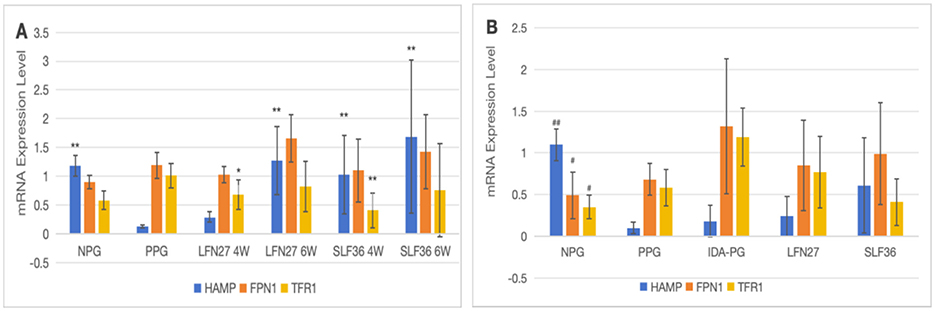Figure 12. Effects of iron supplements on mRNA expression of liver iron metabolism-related indicators in pregnant anemic rats. (A) Physiological pregnancy anemia model; (B) pregnancy anemia model after IDA. Compared with the physiological pregnancy group, *P < 0.05; **P < 0.01; compared with the IDA pregnancy group, #P < 0.05; ##P < 0.01.