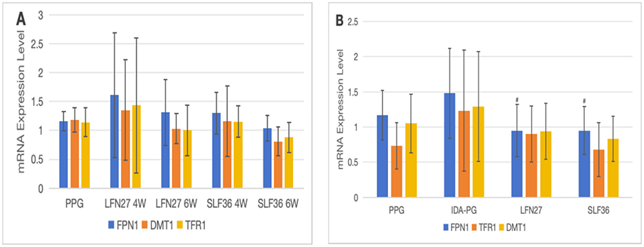 Figure 14. Effects of iron supplements on mRNA expression of iron metabolism-related indicators in the placenta of pregnant anemic rats. (A) Physiological pregnancy anemia model; (B) pregnancy anemia model after IDA. Compared with the IDA pregnancy group, #P < 0.05.