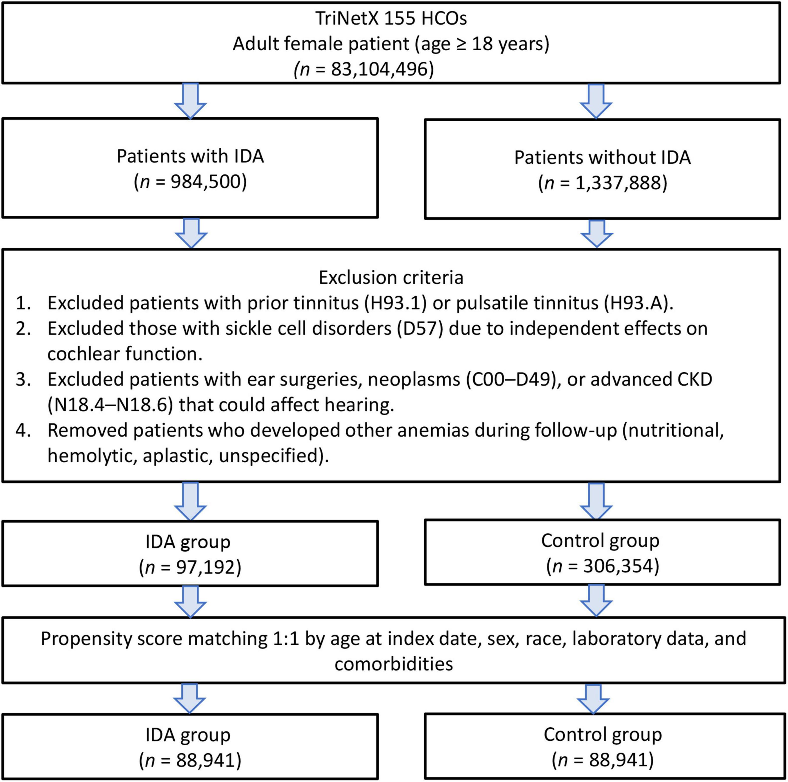 We identified female patients with and without IDA between January 1, 2010, and December 31, 2022, from the TriNetX database. The study focused exclusively on female patients because this population experiences higher rates of IDA due to menstrual blood loss and pregnancy-related demands while simultaneously having lower occupational noise exposure than males, thereby minimizing this important confounding factor for hearing-related outcomes. IDA was defined as concurrent hemoglobin levels below 12 g/dL and serum ferritin concentrations below 30 ng/mL (26), both recorded within a 3-month period to ensure temporal consistency between these diagnostic markers (index date). The control group comprised female patients without IDA, defined as those with hemoglobin levels above 12 g/dL combined with serum ferritin concentrations exceeding 30 ng/mL within the same 3-month timeframe. To address the potential bias from differential healthcare utilization patterns, we required all patients in the control group to have at least six hemoglobin measurements recorded during the study period, ensuring comparable levels of medical surveillance between groups.