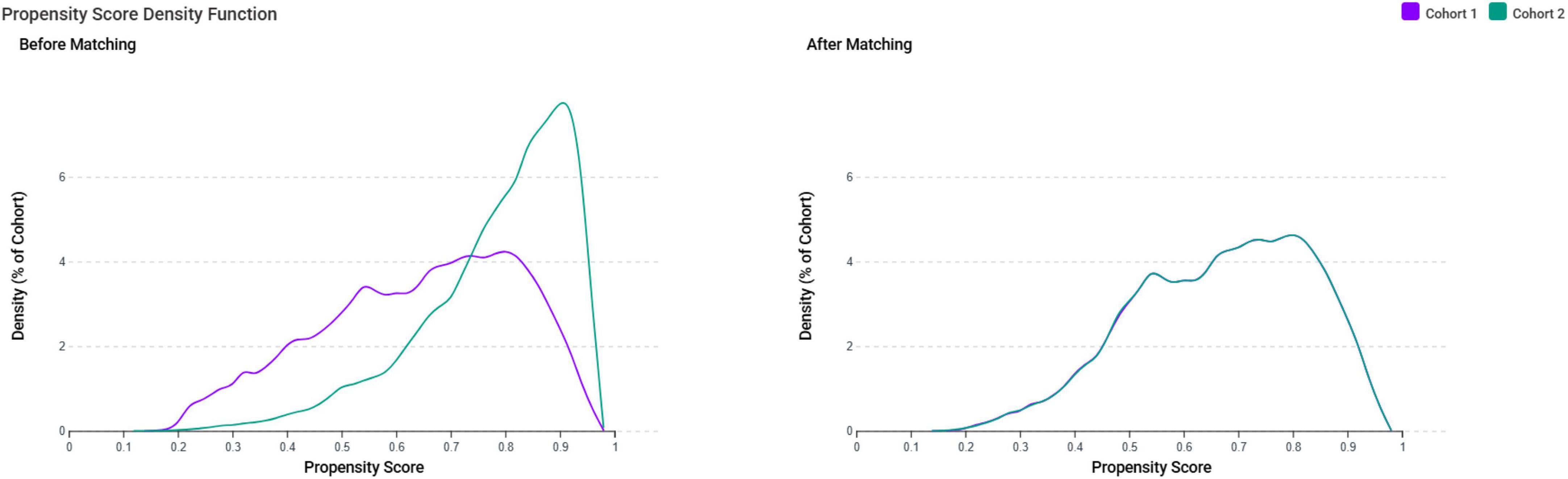 Figure 2. Propensity score density distributions before and after matching. The density plots demonstrate the distribution of propensity scores for the iron deficiency anemia group (Cohort 1, purple) and control group (Cohort 2, teal) before and after propensity score matching. Before matching, the two cohorts showed poor overlap in propensity score distributions, indicating substantial baseline differences. After matching, the distributions demonstrate excellent overlap, confirming successful balancing of baseline characteristics between groups and minimizing selection bias for subsequent outcome analyses.