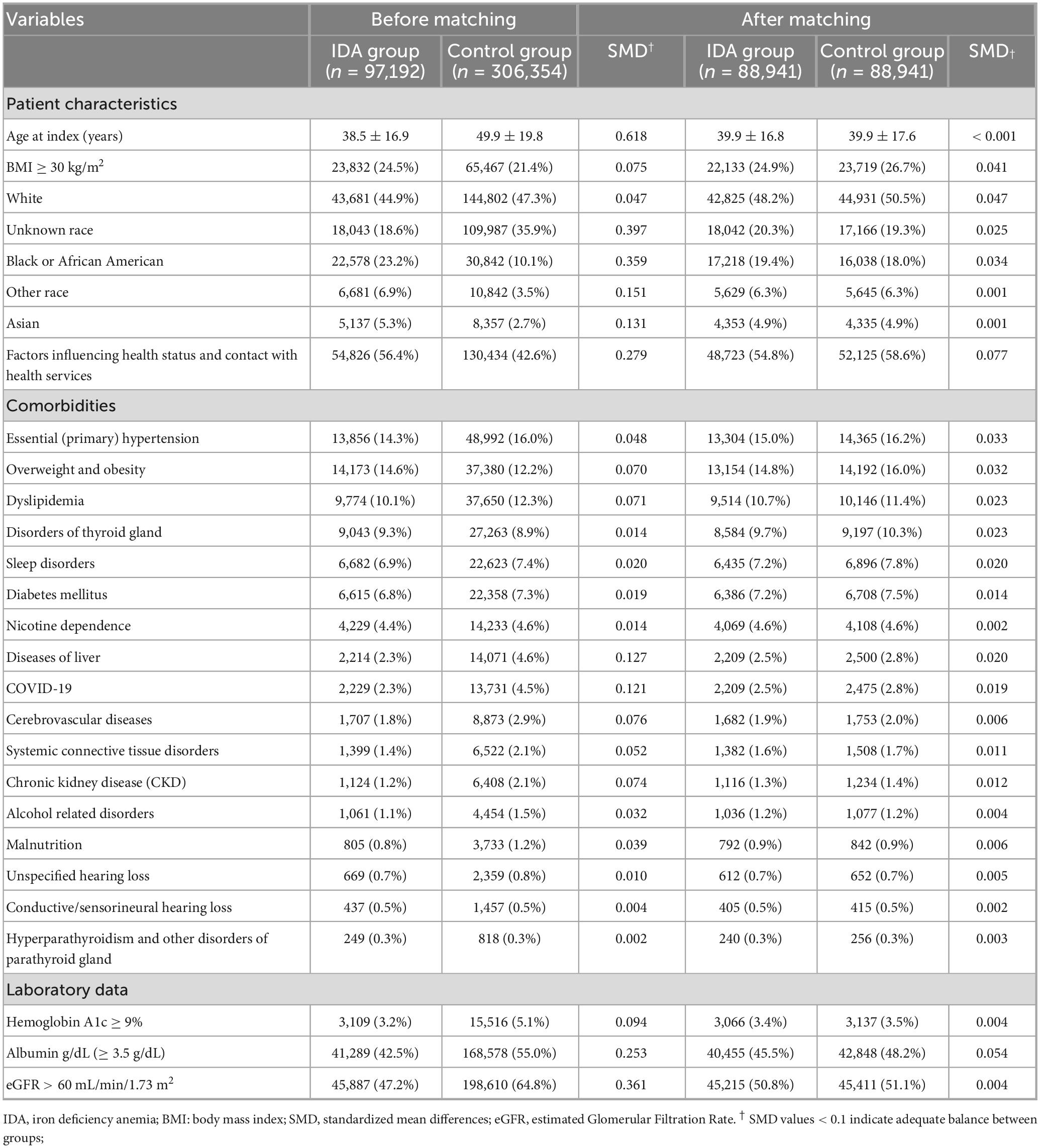 Table 1. Baseline characteristics of female patients with and without iron deficiency anemia before and after propensity score matching.