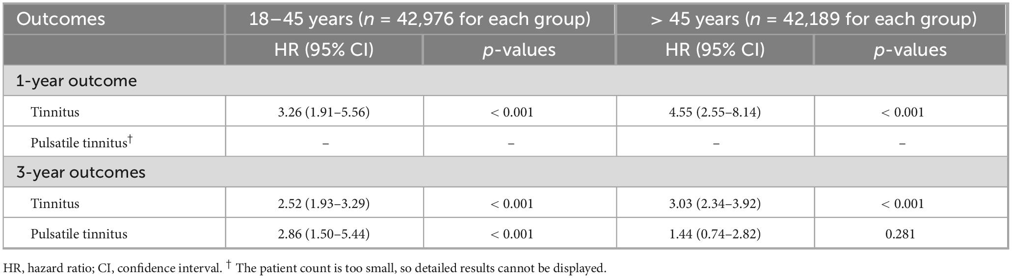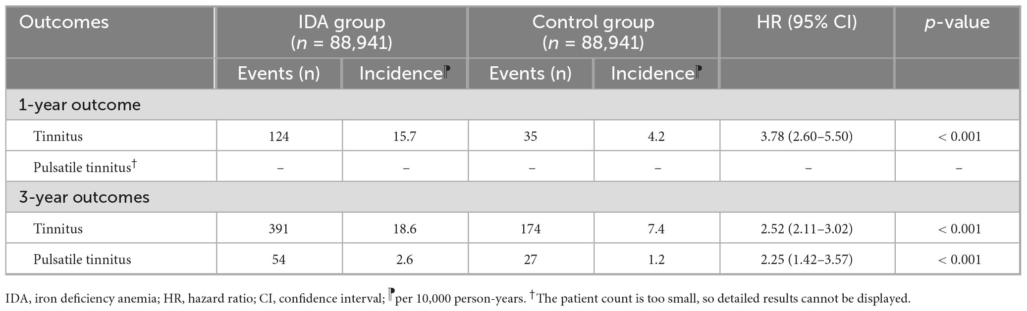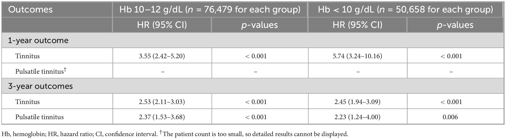 At the 3-year follow-up, the association remained pronounced but showed mild attenuation (HR 2.52, 95% CI 2.11–3.02, p < 0.001), with incidence rates of 18.6 versus 7.4 per 10,000 person-years (Table 2). The sustained yet slightly weakened association could reflect partial iron restoration in some individuals or adaptive physiological responses. Furthermore, IDA was associated with a significantly increased risk of pulsatile tinnitus at 3 years (HR 2.25, 95% CI 1.42–3.57, p < 0.001), a distinct entity frequently related to vascular pathology.